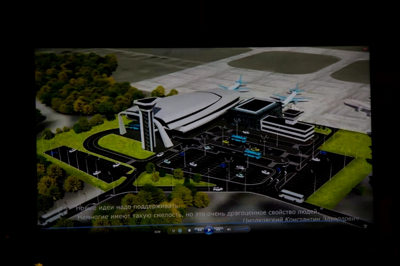 После осмотра строительства собравшиеся обсуждают проект аэровокзала. Он расположится рядом со зданием аэропорта. Проект пока не утвержден, за право спроектировать сооружение борются две фирмы.