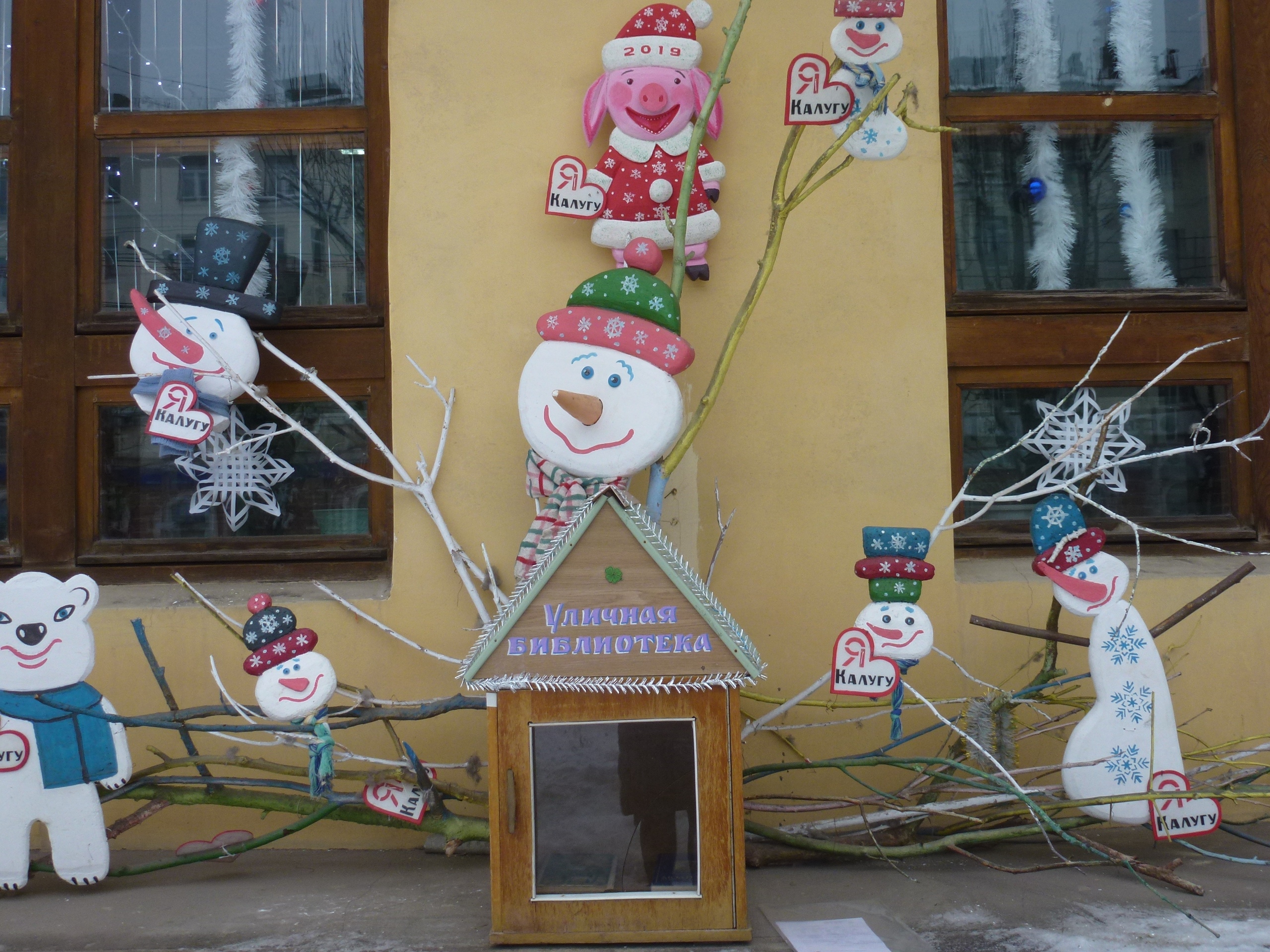 К слову, композиции у библиотеки давно стали визитной карточкой учреждения. Сотрудники библиотеки к каждому празднику стараются удивить калужан. Увы, новогодняя композиция простояла всего несколько дней. Ранее библиотека не раз подвергалась нападкам вандалов. Периодически перед 9 Мая вырывают цветы с её клумб.