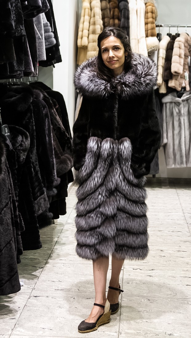 Я пока внимательно изучаю каждое изделие: мех густой и шелковистый, аккуратные швы, плотная мездра, надежная фурнитура. В качестве сомневаться не приходится: в подтверждение моих мыслей Ирина рассказывает, что 2 года подряд “Elena Furs” становилась победителем национальной премии «Товар года» в номинациях «Лучшие шубы России» и «Лучший ассортимент шуб». И это неудивительно: компания “Elena Furs” одна из немногих шьет шубы из самого дорогого и роскошного меха – баргузинского соболя. Я с удовольствием примерила новинку этого сезона: соболиную шубу с укороченным рукавом и красивейшим воротником. Но купить решила более практичный вариант: мой выбор пал на комбинированный полушубок из американской норки Blackglama с отделкой из куницы.