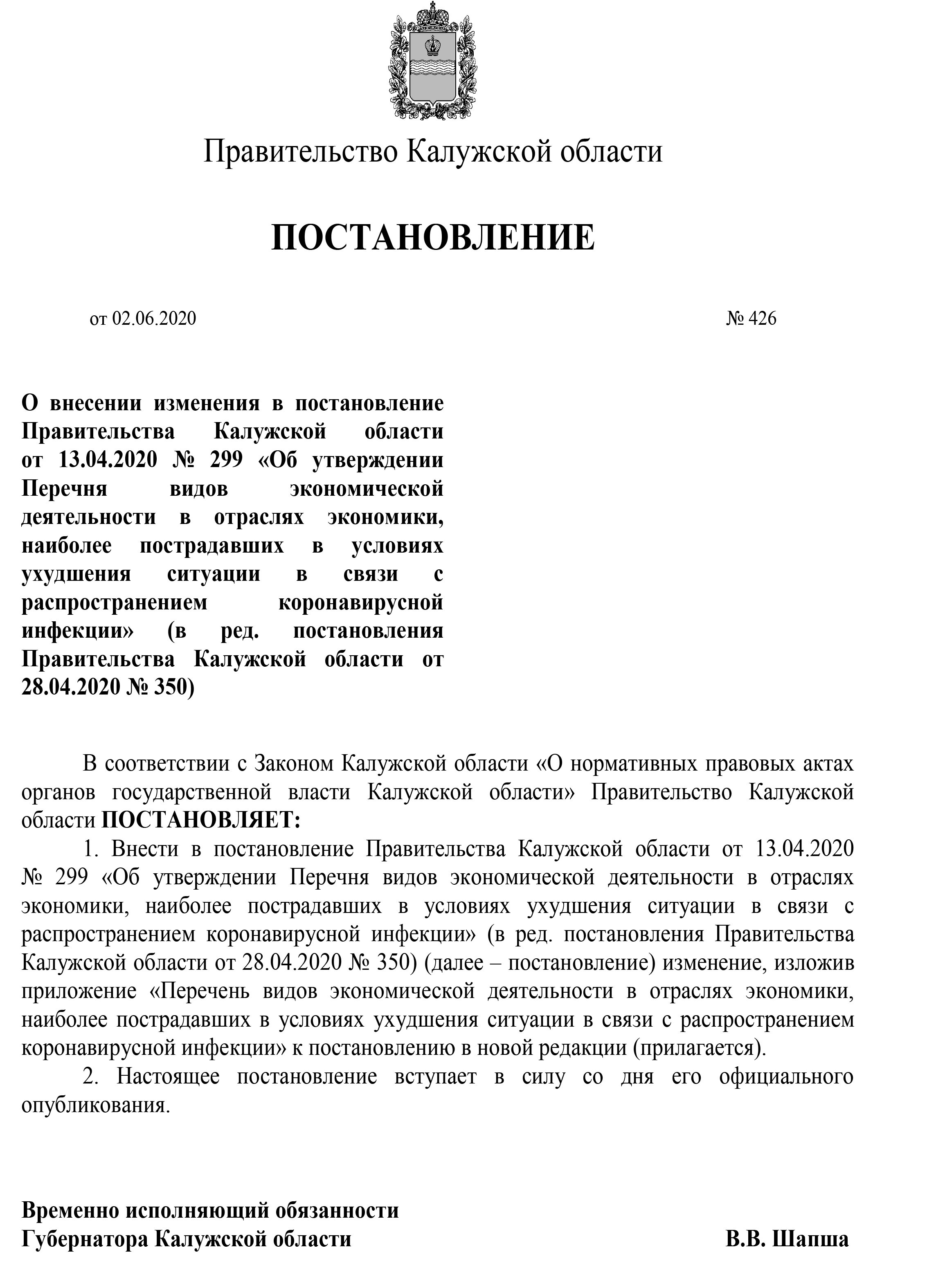 Полный текст постановления правительства Калужской области №426 от 02.06.2020: