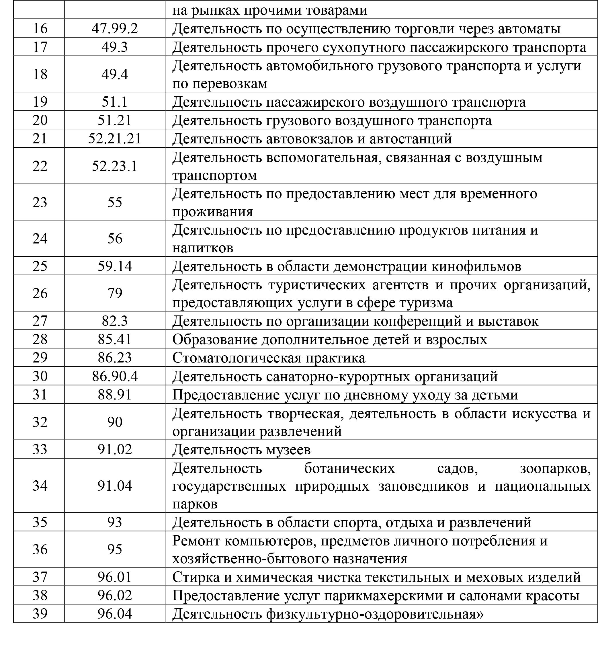 На данный момент в списке указаны 39 видов экономической деятельности: