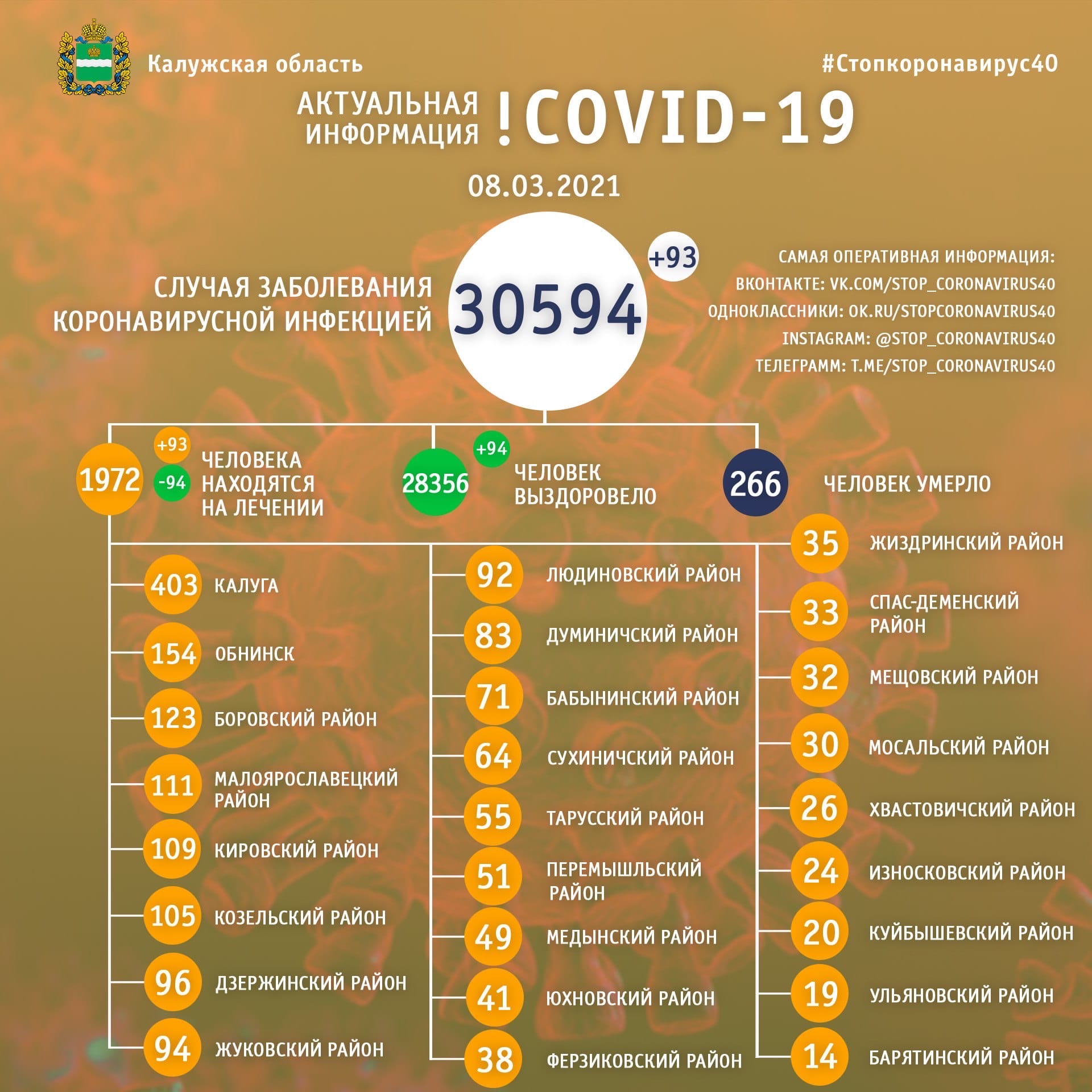 По данным на 8 марта число больных коронавирусом в Калужской области выросло на 93 человека