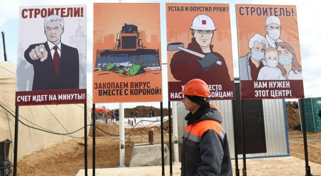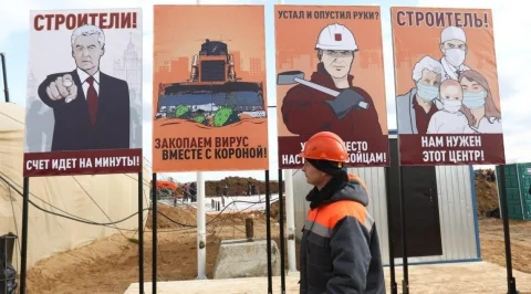«Закопаем вирус вместе с короной!», – призывает плакат на стройке инфекционной больницы в Новой Москве. Фото: Кирилл Зыков / Агентство «Москва».