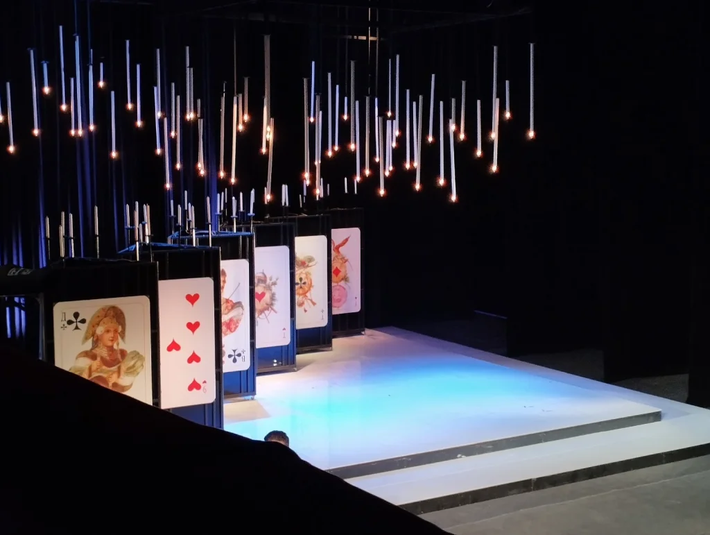 От декораций было сложно оторвать взгляд. Свечи под потолком, ширмы в виде огромных карт, из-за которых появлялись герои, - всё смотрелось очень органично, внушительно, помогало составить нужный по сюжету образ, формировало впечатление. Это прекрасно дополняло образ главного героя Арбенина: картёжника, для которого существует только холодный расчёт (но на горячую голову).