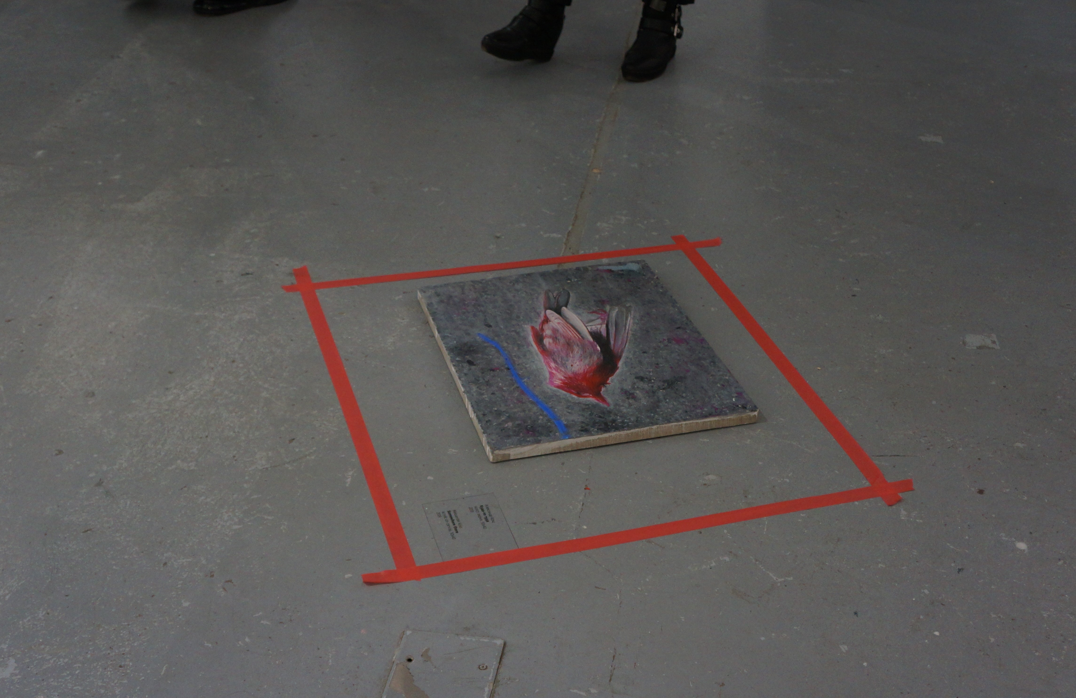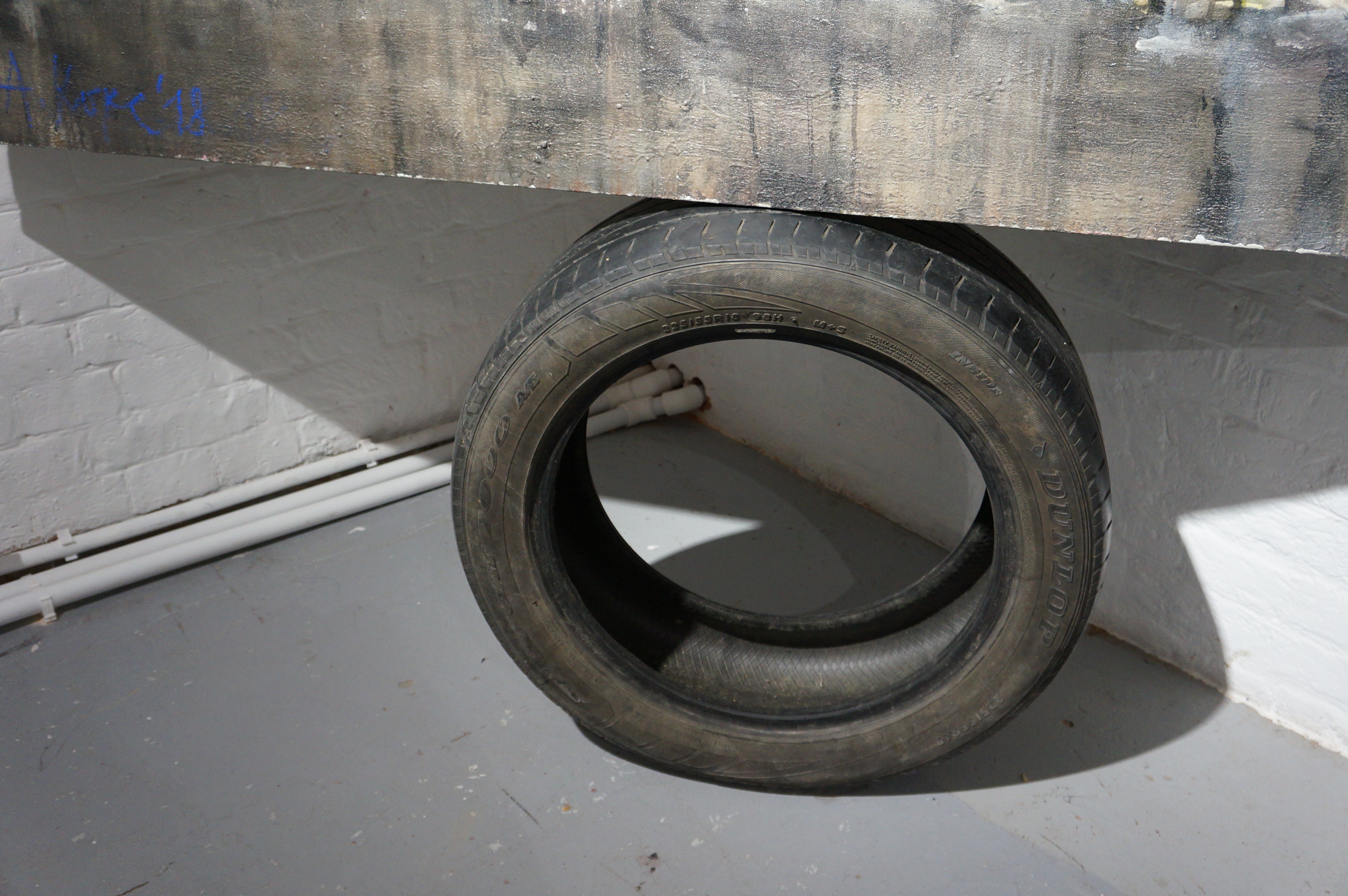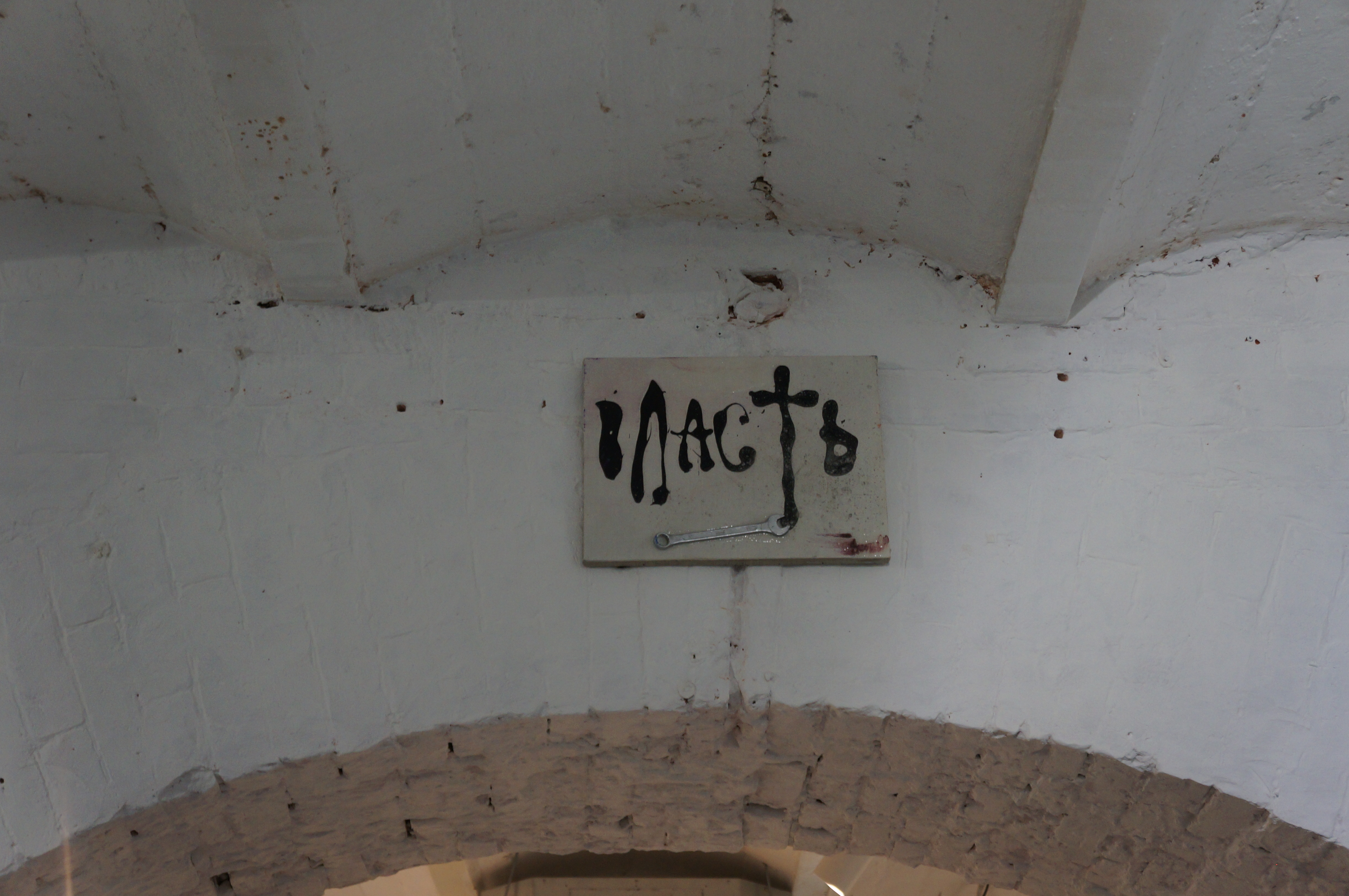 В этом отражении власть нависает над нами, угрожая в любой момент упасть гаечным ключом на голову. Стеклянная бутылка с этикеткой-Лениным набита камнями и брошена у забора. Прекрасная птицы валяется на полу. Холст художника балансирует на приставленной к стене старой шине.