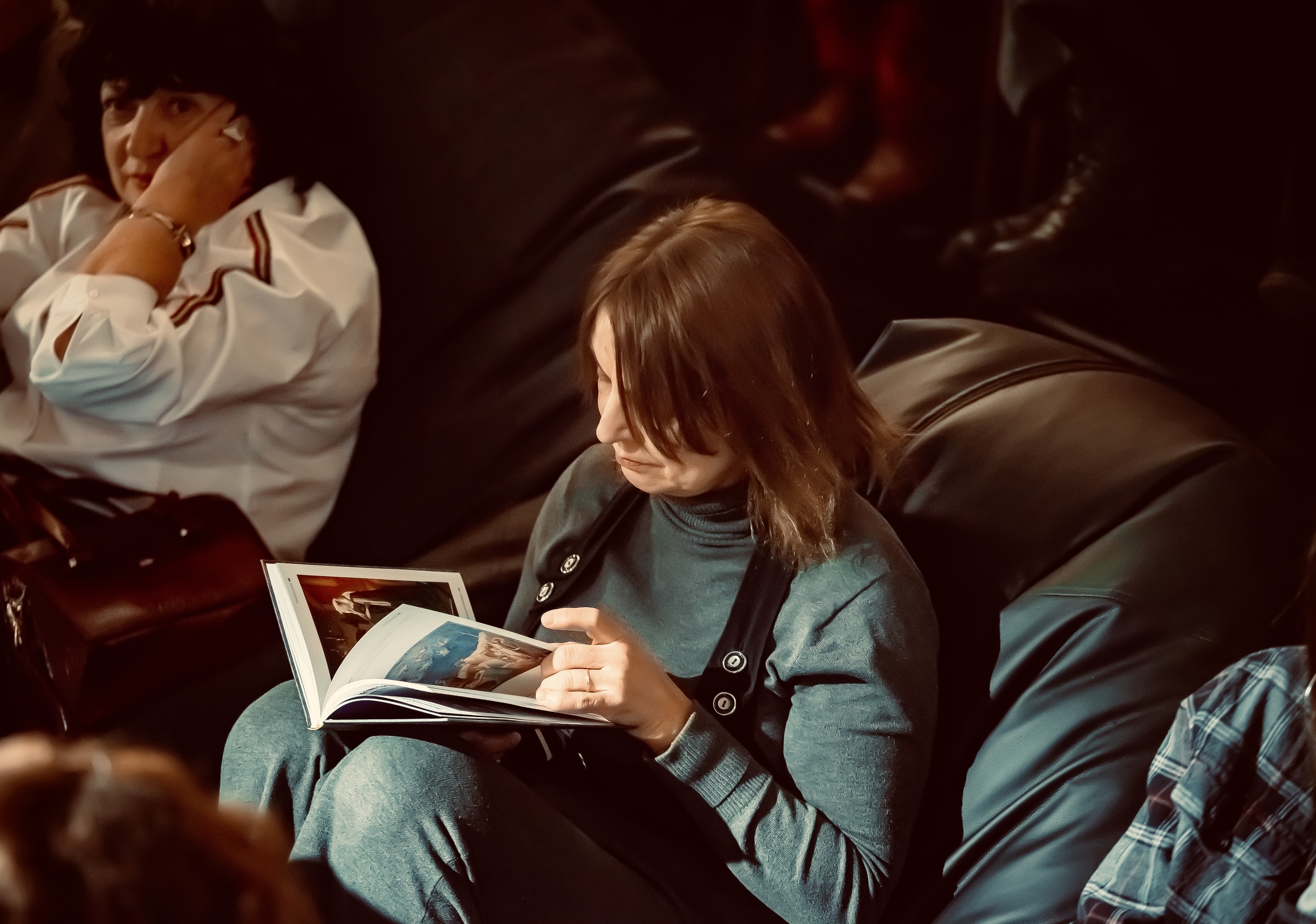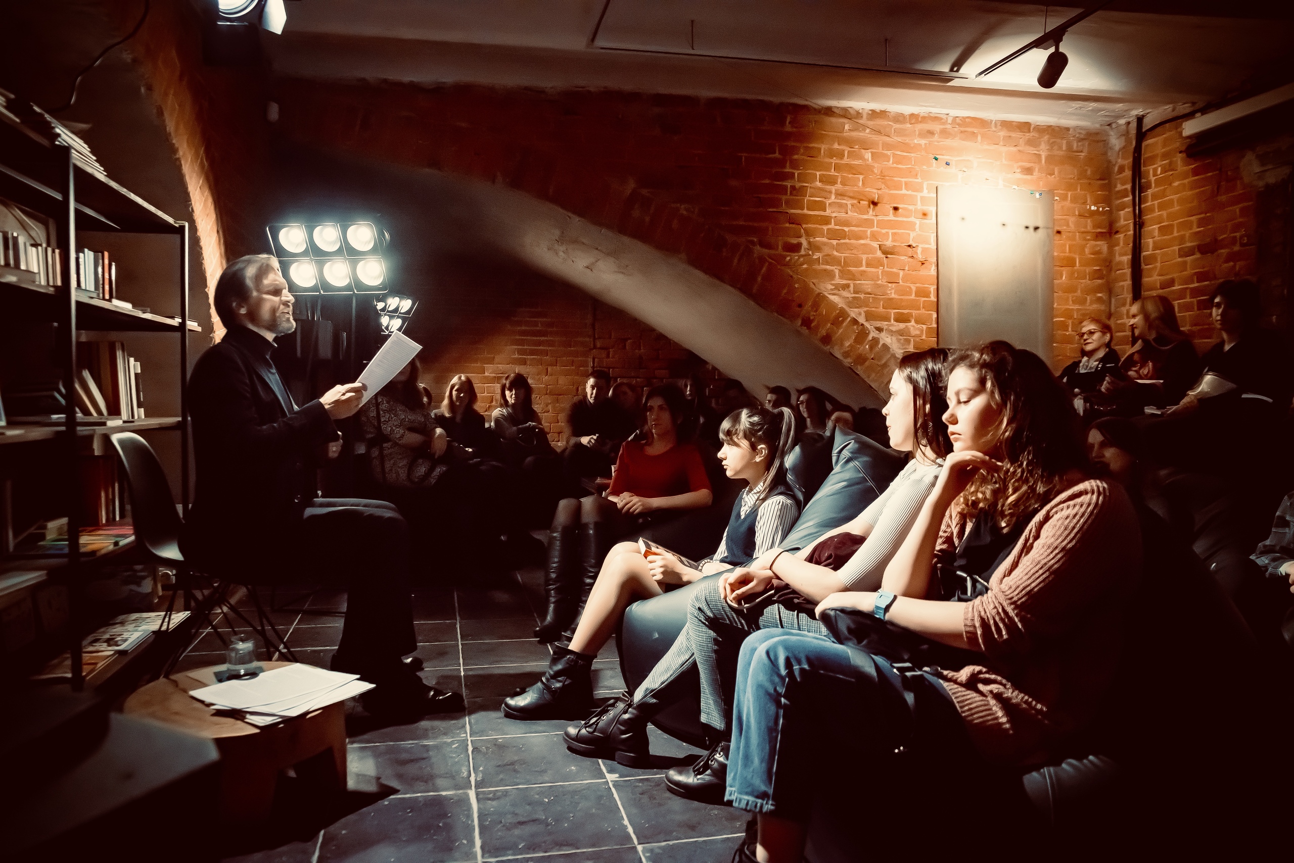 Желающих первыми оценить новое пространство в пространстве оказалось на удивление немало – люди самых разных возрастов заходили с улицы и спускались из галереи. Скоро закончились свободные пуфики, затем стулья, следом места на подушечках на ступеньках лестницы, а потом и стоячие места.