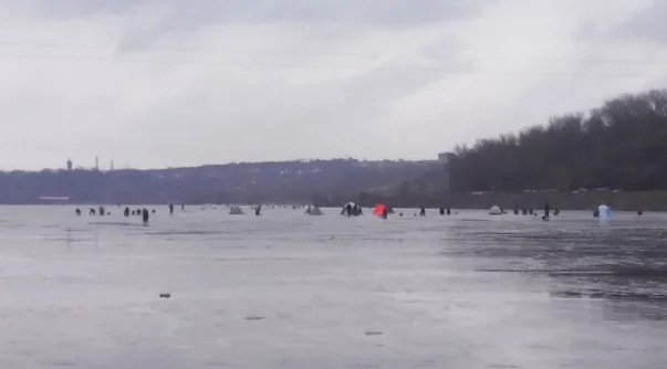 С утра выдвинулись в сторону Оки, за Никольское. Прибыли на место в сумерках и, решив не дожидаться рассвета, выдвинулись к реке. Доехать до самого берега не решились, так как дожди слегка подразмыли дорогу, а там, где остался снег – он превратился в очень скользкую наледь. Издалека река выглядела темной, но решили, что это лед притопило водой. Выйдя на берег, поняли, что мы ошибались – это была открытая вода. В затонах лед еще был – решили проверить толщину. Три шага от берега – лед уверенно сопротивляется ударам пешни. Пять шагов – есть старая лунка – проверяем, лед 10-12 сантиметров – можно ловить. Решили сделать еще пару шагов в сторону открытой воды, чтобы быть до конца уверенным. Есть еще лунка. Для проверки бьем пешней – в стороны разбегаются трещины. Лед сантиметра 3-4…Бежим.