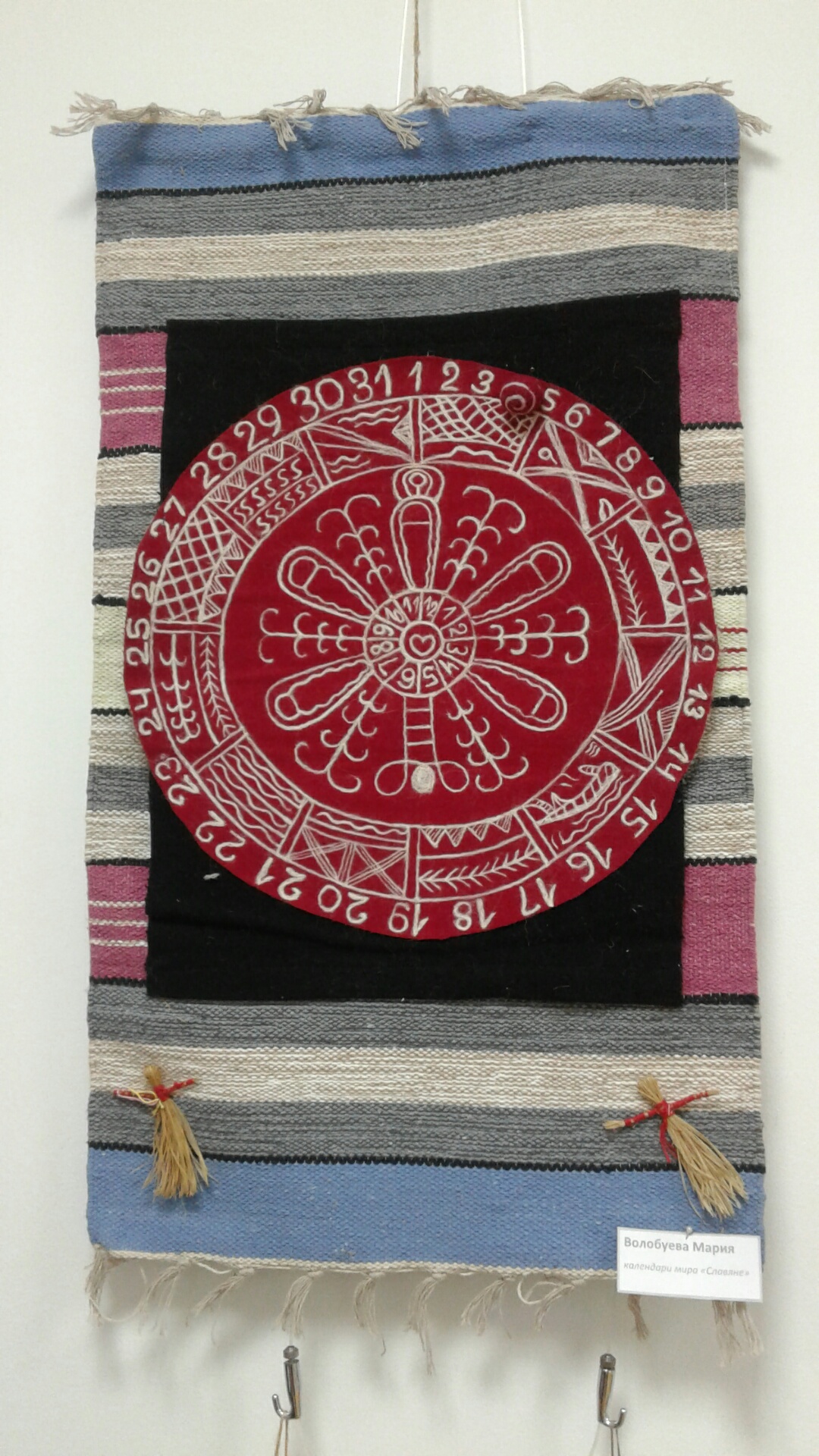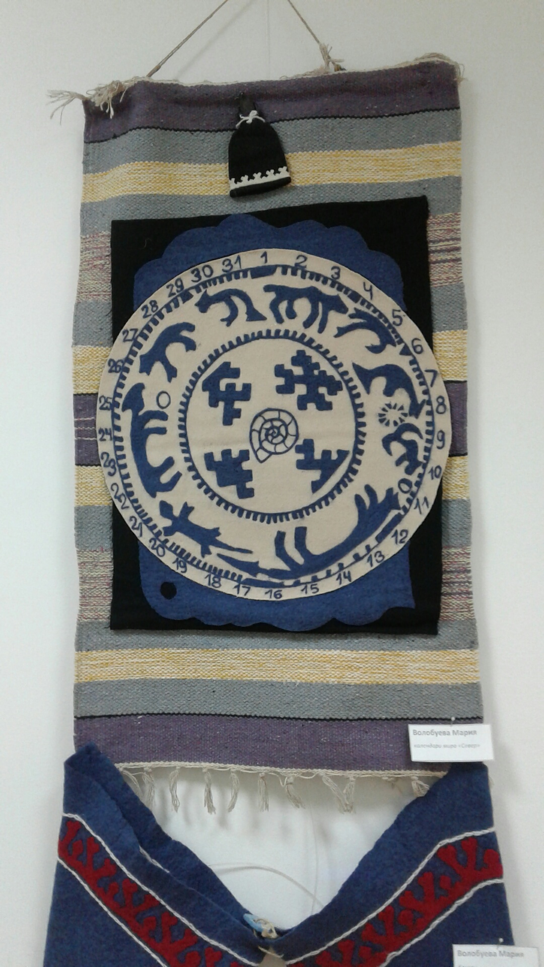 Триптих деревенские приключения Павлушки и Лушки, мальчика и девочки из деревни на реке Чусовой. И бесконечный календарь в виде круга, на котором изображена деревня в разное время года и цифры от 1 до 31. Изо дня в день нужно перевешивать валеночки по кругу. Идею я позаимствовала у охотничьего календаря манси, в этом календаре изображены звери, на которых охотятся в то или иное время года.