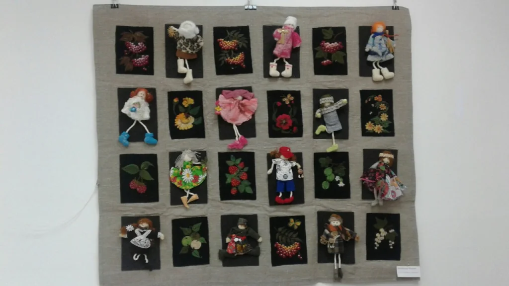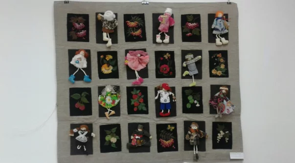 Триптих деревенские приключения Павлушки и Лушки, мальчика и девочки из деревни на реке Чусовой. И бесконечный календарь в виде круга, на котором изображена деревня в разное время года и цифры от 1 до 31. Изо дня в день нужно перевешивать валеночки по кругу. Идею я позаимствовала у охотничьего календаря манси, в этом календаре изображены звери, на которых охотятся в то или иное время года.