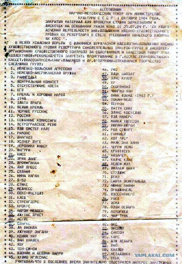 В 1983 году после того, как нашего дорого Леонида Ильича сменил КГБ-шник Андропов, начали завинчивать винтики в том числе и в среде молодежной культуры. Стали появляться списки запрещенных групп - перечень зарубежных и советских подпольных исполнителей, чьи записи не рекомендовано ставить на дискотеках. Их нельзя было записать в официально разрешенных студиях звукозаписи. Вот дословно: «Hа основании приказа N 361 от 25.07.84 "Об упорядочении деятельности ВИА и повышении идейно-художественного уровня их репертуара в свете требований Июньского /1983 г./ Пленума ЦК КПСС", в целях усиления борьбы с влияниями буржуазной идеологии, повышения идейно-художественного уровня самодеятельных ВИА, рок-групп, качества работы этих коллективов рекомендуем запретить проигрывание и демонстрацию в г. Москве грампластинок, компакт-кассет, видеороликов, книг, плакатов и другой продукции, отражающей деятельность следующих групп…».