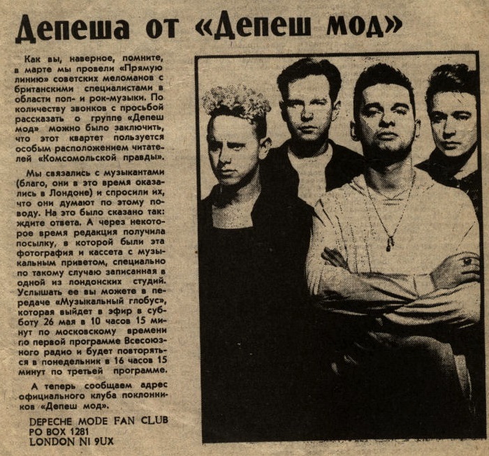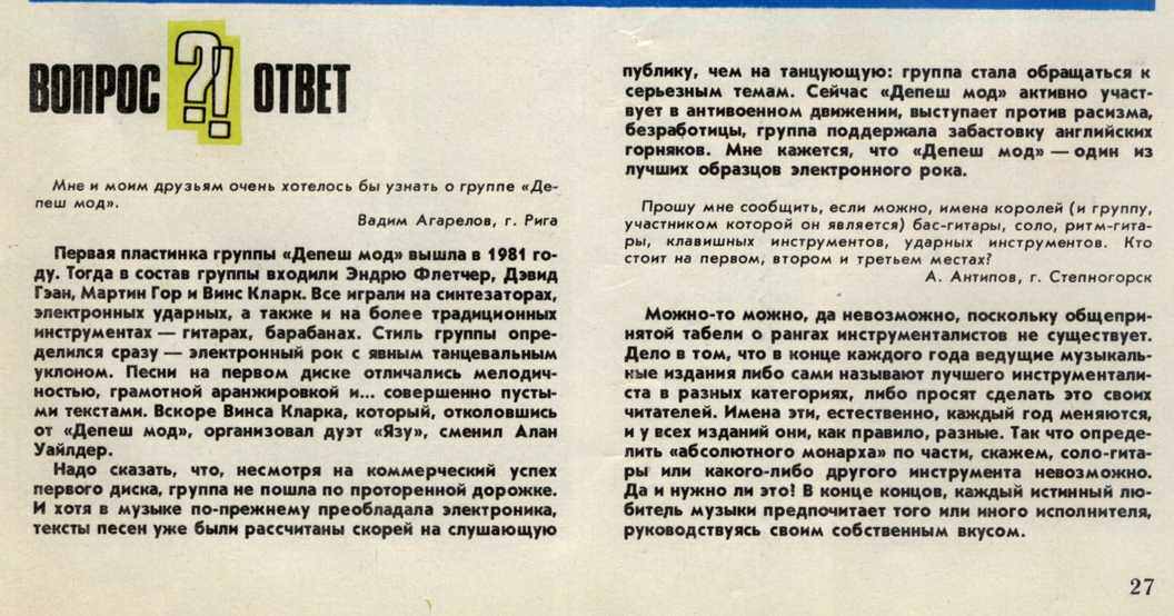 Возвращаемся на родину. Во время фестиваля молодежи и студентов в 1985 году действительно обсуждался вопрос о приезде группы в Москву, но нам достался британский дуэт “Everything but the girl”, а ДМ увидела Венгрия и Польша. Но всё же романтичные и меланхоличные мотивы загадочных и пока еще малопонятных ребят из холодной Англии дошли до нас. В июле 1986 года ДМ впервые упомянуты в советской прессе. Журнал «Ровесник» слыл самым прогрессивным и любимым у меломанов СССР всех возрастов. Он выходил сумасшедшим тиражом и был доступен любому. В том номере группу упомянули в статье «Второе дыхание рока?», а в рубрике «Вопрос-ответ» совсем коротко дана информация о группе. Вот эта заметка, примечательно, что вопрос поступил от жителя Риги, как я и писал выше, более свободной и «западной», в отличии от других регионов страны советов.