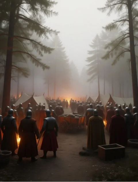 Парк культуры и отдыха - в дыму от костров. Вокруг - телеги с провиантом и повозки с оружием.
