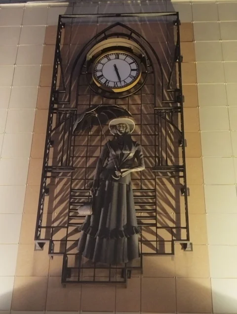 В центре Калуги, на пешеходной улице, на стене торгового центра, находятся часы, а под ними - кованная девушка с зонтиком, напоминающая Мэри Поппинс.