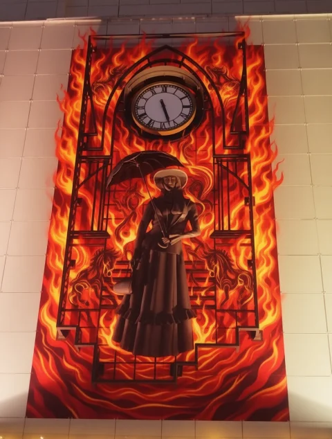 Знакомый образ преобразился, вобрав в себя всю мощь стихии года. Нейросеть сделала девушку с зонтиком огненной красавицей с лошадками по обеим сторонам.