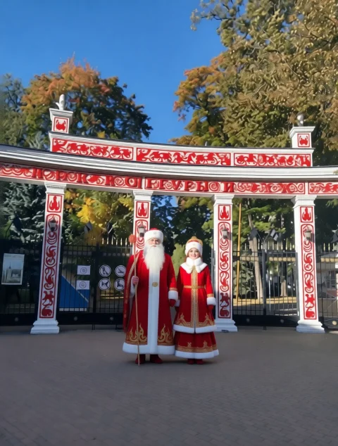 Дед Мороз и Снегурочка с легким налетом гигантизма, одетые в огненном стиле 2026 года, встречают гостей парка.