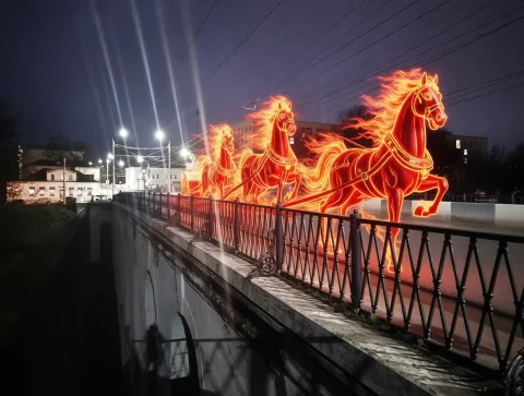 Три коня, замершие в прыжке, будто сказочные персонажи, несутся сквозь огненную арку- их световые следы отражаются в огоньках, превращая картинку в спектакль для тех, кто верит в чудеса. 2026-й начинается не с календаря, а с нового огненного ритма жизни.
