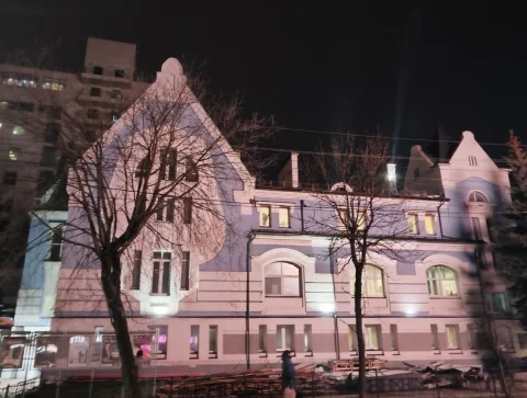 Калужский Дом музыки нейросеть окутала синим мерцанием, а над фасадом взлетела Красная Огненная Лошадь.