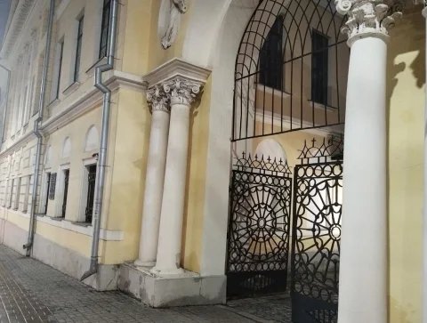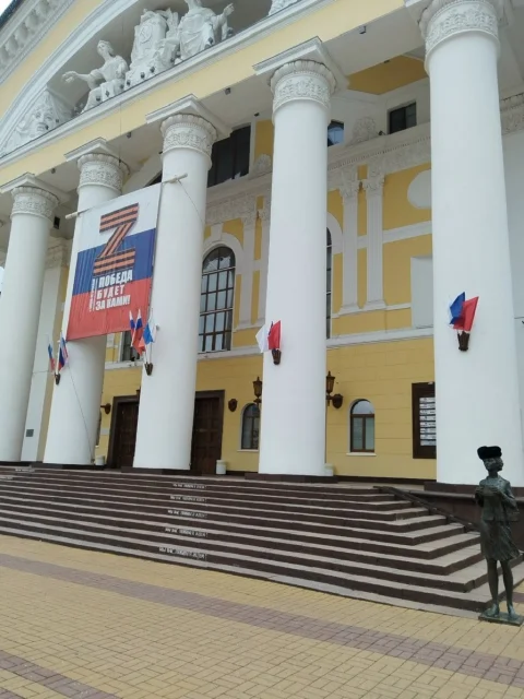 Калужский драмтеатр нейросеть увидела в огненной маске: золотые кони стали главными актёрами, словно вырванные из новогодней сказки, летают между колоннами, а красные фонари, висящие над лестницей, горят, как яркие реплики в спектакле.