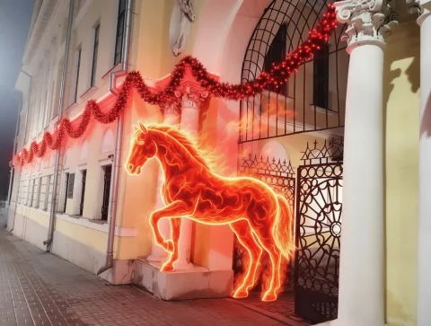 Старинные стены краеведческого музея нейросеть нарядила в огненные гирлянды. Лошадка у входа как будто предлагает прикоснуться к светящейся гриве на удачу в будущем году.