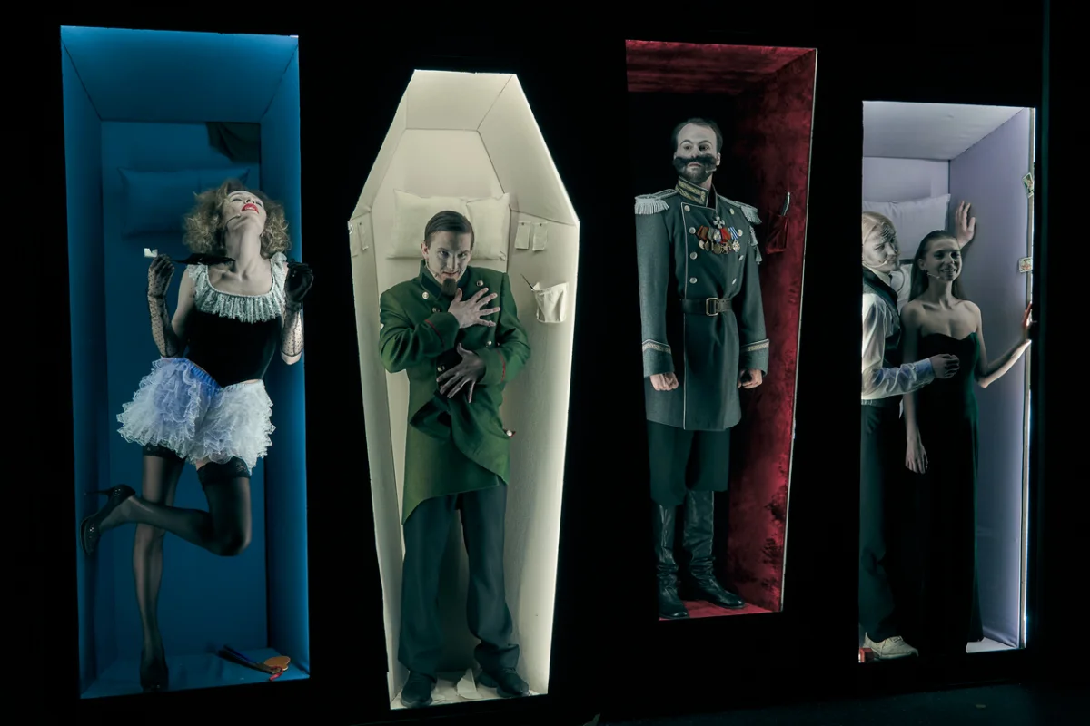 Спектакль начинается с того, что какой-то алкоголик пристает к зрителям, предлагает выпить с ним, пытается завязать разговор. Потом перед публикой раскрывается ширма, а за ней гробы, в которых стоят, как мы понимаем, умершие люди в костюмах позапрошлого века.