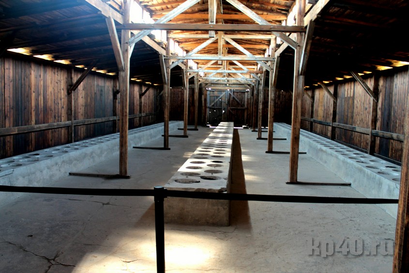 Это гигиенический барак. Круглые отверстия - это, как, я надеюсь, ты уже понял, толчки. Пропускная способность барака - около тысячи человек в минуту. За раз в него загонялось несколько сотен человек, а через 10, максимум 20 секунд - уже следующая партия. Посетить гигиенический барак можно было только дважды в сутки: утром - перед работой, и вечером - после неё.