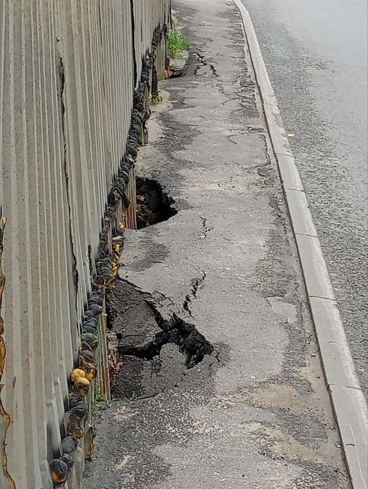 Провалился тротуар на улице Железняки. Ширина тротуара в этом месте и раньше была меньше 1 метра, сейчас половина, скоро ничего не останется.
