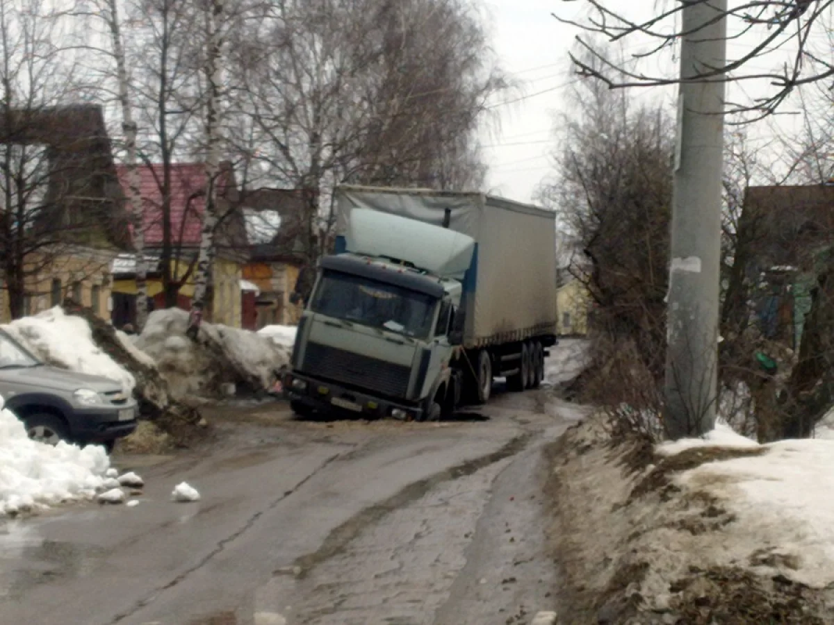 В Калуге на улице Механизаторов многотонный МАЗ частично провалился под асфальт. Зимой на этом месте водоканал проводил ремонтные работы, по окончании которых вырытый котлован был засыпан щебнем. С приходом весны яма стала образовываться вновь. Недавно в ловушку угодил автомобиль БМВ, а теперь и грузовик. Сотрудники ГИБДД уже на месте аварии.