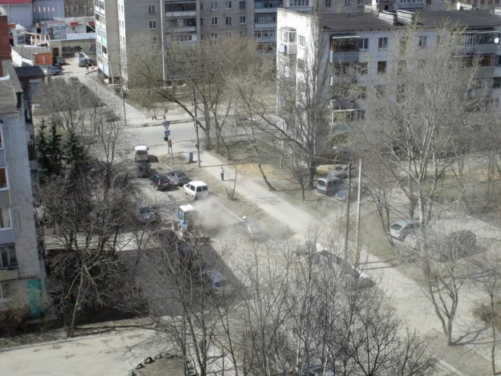 Снято сегодня, 26 апреля в 14-40. Трактор метет дорогу, поднимая тучи пыли в воздух. Дышите граждане.