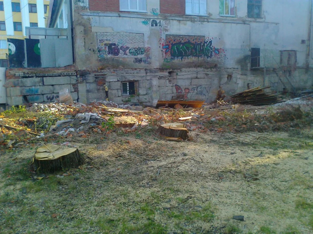 Рядом с магазином "Пятёрочка" (ранее кафе "Чайка") расчистили площадку под строительство. Ранее там были недостроенные ещё в советсткий период сооружения, которые, я полагаю, должны были увеличить площади тогдашнего кафе-столовой. Вместе с расчисткой были устранены деревья, мешавшие, видимо, строителям. Работы по устранению деревьев производились спецбригадой с подъёмником, вероятно, относящейся к зеленстрою (не могу утверждать, но очень похоже работали). Деревья были нормальными, не больными, не валились на бок, с листвой и ничему не угрожали, кроме проведения стройки и возведения забора на этом месте. Остались только пни. Их и можно лицезреть на фото. Куда писать о таком беспределе?