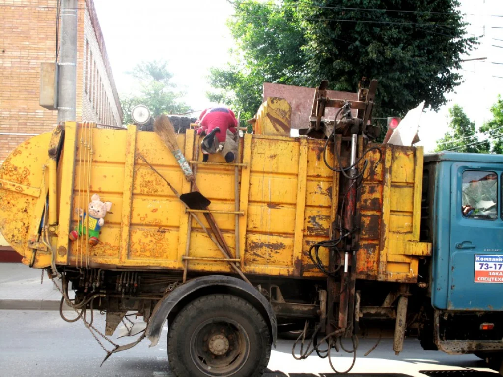 Иду рано утром на работу, и тут из подворотни на Московской вылетает мусороуборочная машина, сворачивает на Суворова и глазам своим не верю - сбоку прицепились знакомые с детства персонажи. Рассмешило до слез!