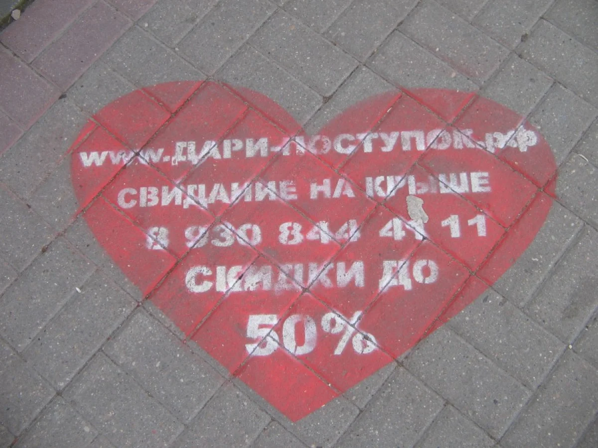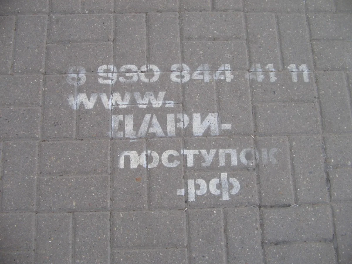 А вот за подобные объявления предусмотрены ли какие-нибудь санкции? Эти трафаретные надписи сняты на ф/аппарат на улице Кирова, на чётной стороне (возле магазина "Мир Фото"), хотя не уверен, что и в других местах их нет. Что значит "скидки до 50%"? Это будет скинуто с крыши до половины собравшихся? В любом случае, думается, подобные "объявы" - лишние на драгоценной плитке. Уж очень дорого она нам всем обошлась...