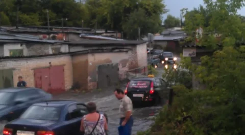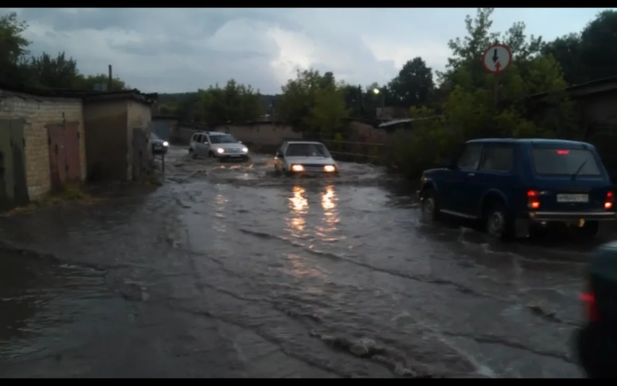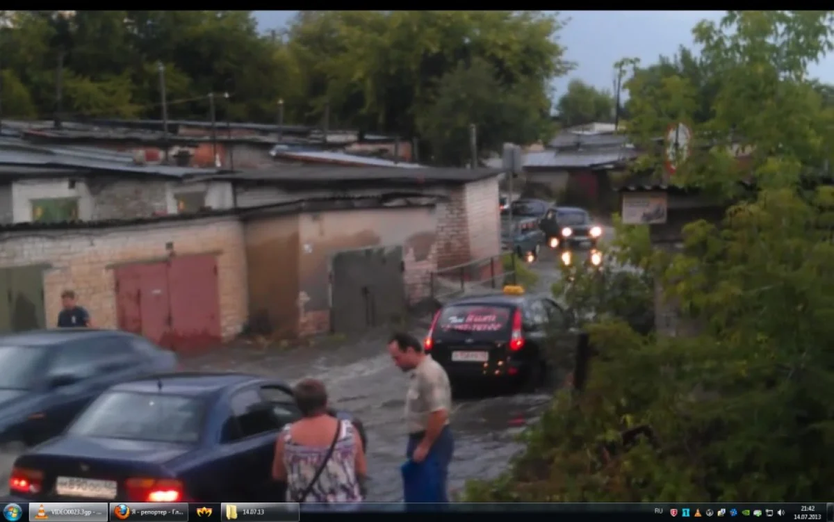 После дождя в 7 часов вечера 14.07 на Киевском проезде снова образовалось озеро, которое автомобили пересекали на грани. В этот раз озеро дополнилось сильным потоком воды, который несся поперек дороги, как горная река. Поток воды между двумя гаражами был действительно очень сильный, такого не видел ни разу. Либо вода с улиц не успевала уходить, либо сбросили откуда-нибудь.