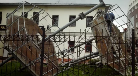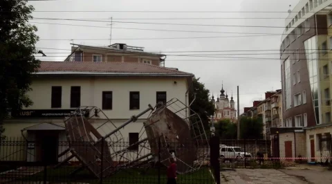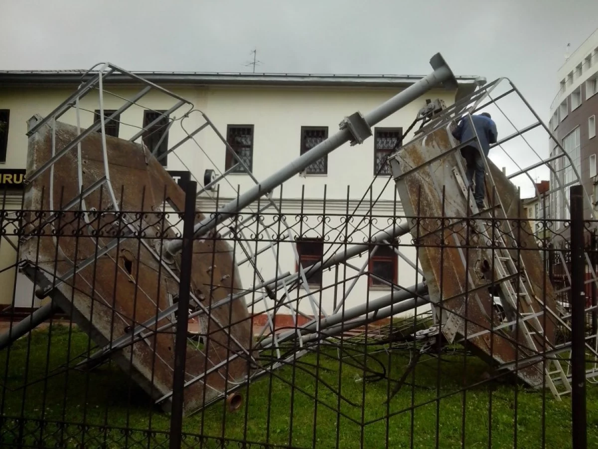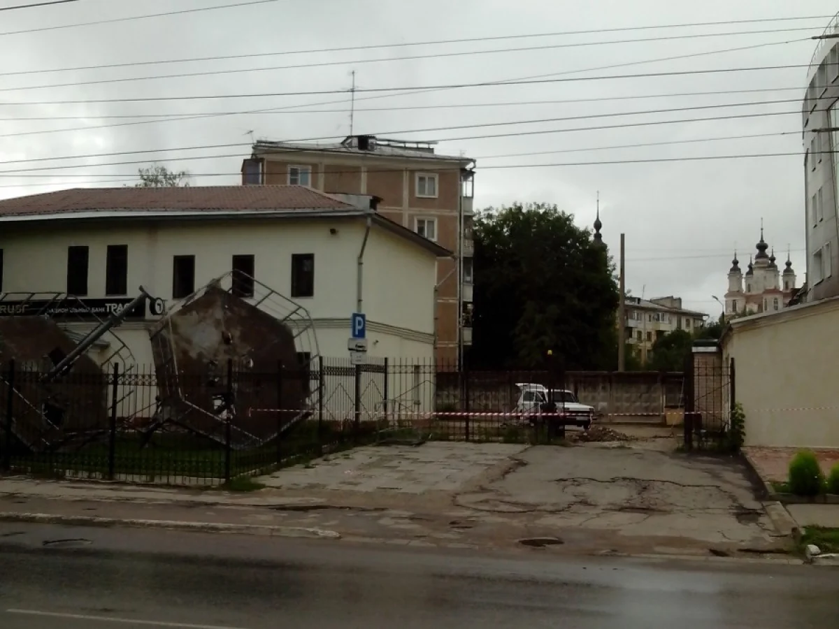 Проходя мимо здания "Траст-Банка" (ул.Жукова, 1) утром в субботу, 20 июля, с удивлением обнаружил, что "парашютная вышка", что очень многие годы находилась во дворе этого заведения, лежит на земле. Демонтирована и разрезается на мелкие части. Согласен, что изначальное предназначение этой вышки стало анахронизмом, но ведь, говорят, что простояла она чуть ли не с довоенных пор (или сразу после войны). Тут пусть Летописец меня поправит. Да, была не нужна по прямому назначению, но можно же было использовать по-иному? Установить различные антенны-передатчики различных видов связи или тому подобное... Но сохранить.Аргумент против - место под парковку на своей же земле.