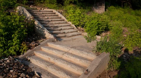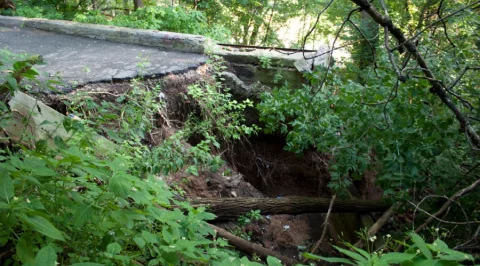 Провал грунта необходимо ликвидировать. А лестницу... Ну хотя бы сделать временный деревянный настил и перила, чтобы люди не проваливались в дырки в бетонных ступеньках.