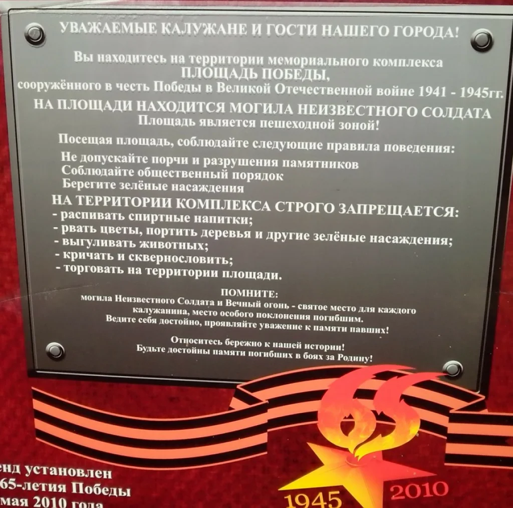 На красочном стенде, размещённом на аллее по ул.Кирове, почти в том месте, где улица переходит в пл.Победы, имеется цветной плакат с Правилами посещения мемориального комплекса на вышеуказанной площади. Вот только вопросы: а многие ли их читали, многие ли делают так, как нужно, а самое главное - кто-то реально следит за их выполнением??? Торговля ведётся и шариками проч., на детских автомобилях катаются тоже не "спасибо", но, главное, распитие алкогольных напитков... Редкие наряды ППС проходят мимо поклонников Бахуса, стараясь не замечать их, свадьбам, откупоривающим шампанское прямо "здесь" как -будто сам Бог велел - кто же будет перечить? Пробки, фольга, пустые бутылки, пластиковые стаканчики, остающиеся после каждой процессии - так, пустяки... А про вечернее время - особая тема. Наутро тракторными тележками вывозят мусор, который скопился всего за несколько вечерних часов! Так, может, перенести Вечный огонь в другое место, чтобы не было нынешнее проходным, где катаются на велосипедах, автомобильчиках, распивают, ругаются, мусорят, да просто тупо изо дня в день следуют мимо - ведь и глаз замылился, и торжественность вся испарилась, и Могила для очень многих, увы, перестала быть святым местом. А на мемориалах вроде Пискарёвского кладбища, на Мамаевом кургане, в Брестской крепости подобной суеты нет, и Вечный огонь - действительно святое место. Там, если говорят, то вполголоса. Там везде тишина, и кое-где тихая музыка. А что у нас? Сплошной гвалт и прочее, что противоречит понятию "Некрополь". Подозреваю, сколько сейчас горлопанов набросится на меня, но перед этим попрошу задать самим себе вопрос: а в нынешнем виде Вечный огонь и Могила Неизвестного солдата в центре шумного города со всеми его атрибутами вас устраивает?