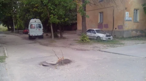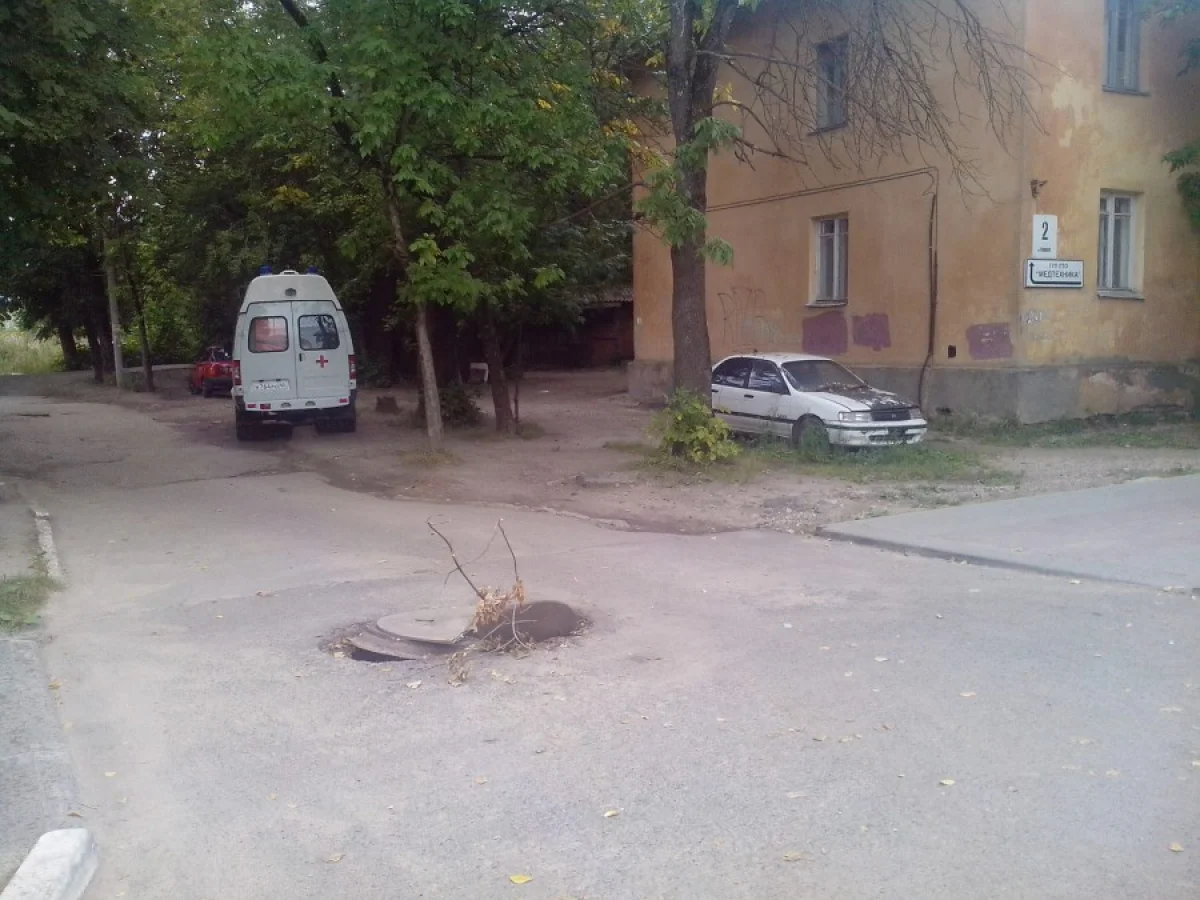 При заезде во двор к медтехнике, въезжающих встречает вот такая красота в виде ямы, расположенной прямо