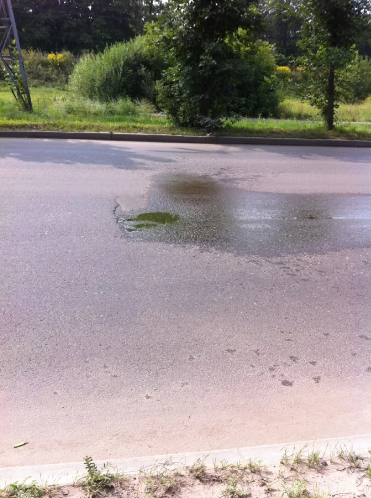 Недалеко от перекрестка улиц Грабцевское шоссе и Молодежная (если ехать из центра) на дороге по улице Грабцевское шоссе на ровной асфальтовой поверхности образовалось небольшое углубление. Асфальт в этом месте "просел". Образовавшееся углубление постоянно заполнено водой. Даже в самую сильную жару, когда асфальт раскален, лужа не испаряется. Думается, что лужа подпитывается из дырявой трубы, лежащей под дорогой. На Яндекс картах, можно увидеть, что в этом месте дорога еще не плачет и ремонт покрытия еще не сделан. На представленном фото видно и лужу и просевший асфальт с трещиной. Как бы не было беды!
