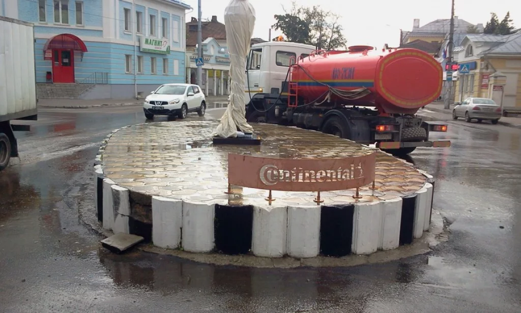 Проезжал сегодня около "мужика в трусах" и увидел что к клумбе прикрутили видимо логотип споснора этого "произведения". Вот так тихо-мирно и рекламку добавили )))