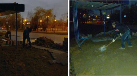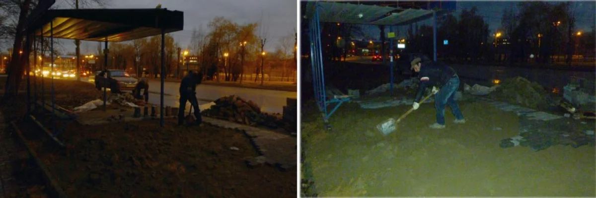 Вечером 14-го ноября у дома №22 по той же улице двое людей в полнейшей темноте выкладывали плиткой остановку общественного транспорта. Увиденное – напрягло. Один из работающих, явно человек из среднеазиатских республик, колотил лопатой какие то безформленные куски, топтал остающиеся куски ногами и поверх этой «консистенции» укладывал плитку. Второй, явно славянской внешности, плитку подносил и, похоже, осуществлял там «общее руководство».