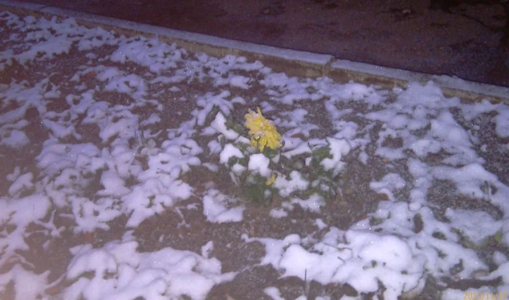 Природа опять преподносит приятные неожиданности. После затяжной теплой осени, сегодня подморозило и выпал снег. Выйдя сегодня на улицу был удивлен, возле подъезда распустился припозднившийся или поторопившийся цветок.