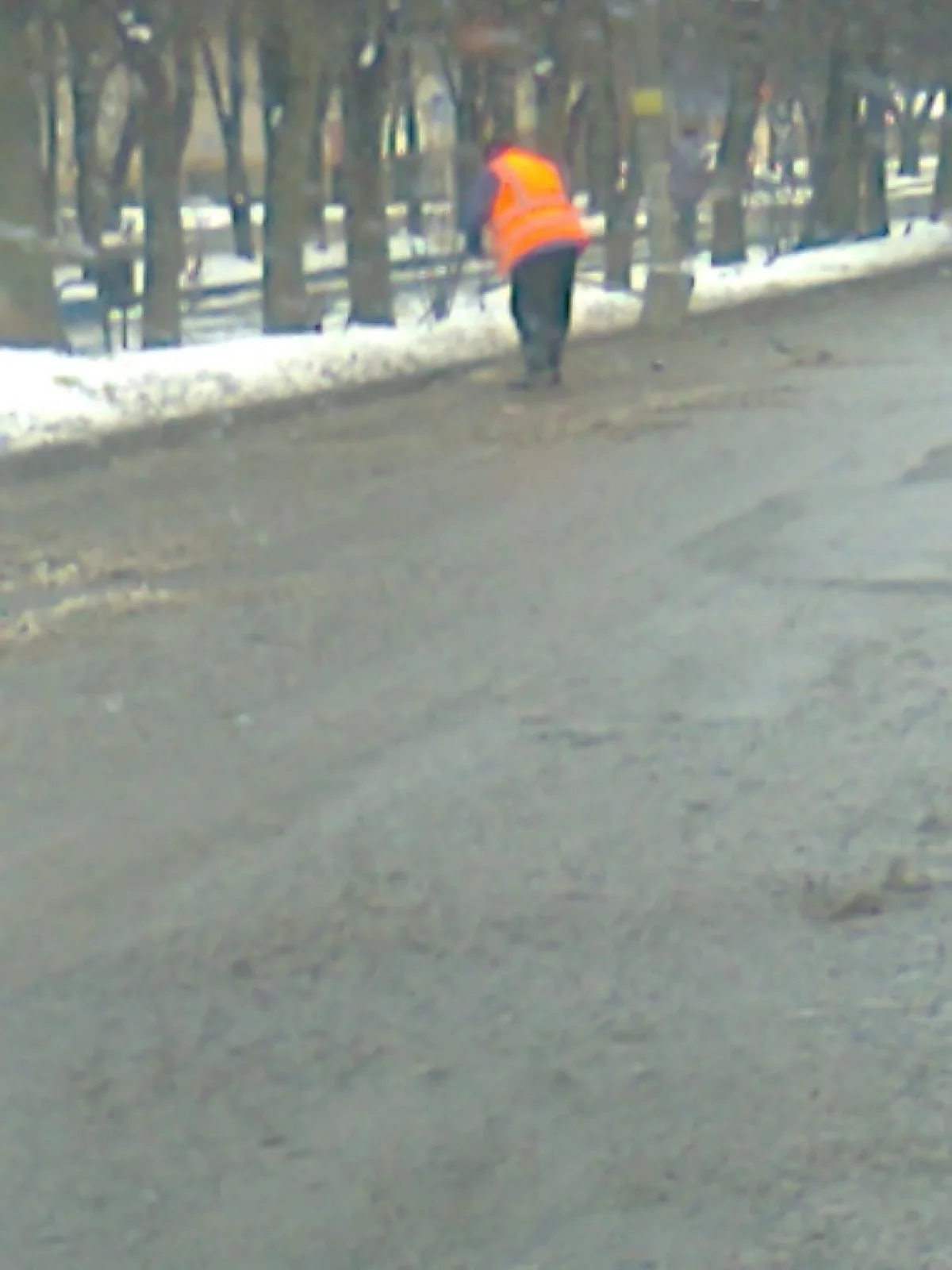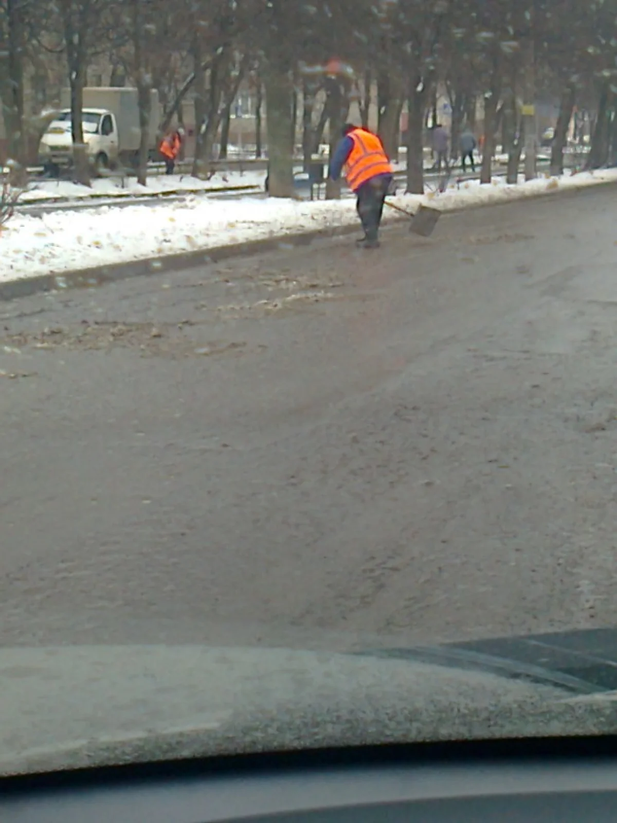 Одна из улиц областного центра в период уборки подрядной организации. От бордюра левой стороны проезжей части убираем снег на полосу движения автотранспорта, с правой стороны кидаем мусор на газон, снегом присыпет, видно до весны не будет, а там ... общегородской субботник всё уберёт... Да, если машины снег к утру с проезжей части не раскидают колёсьями, то утром его уборочная техника подгонит, так что на завтра без работы не будем... Я лично так подумал.