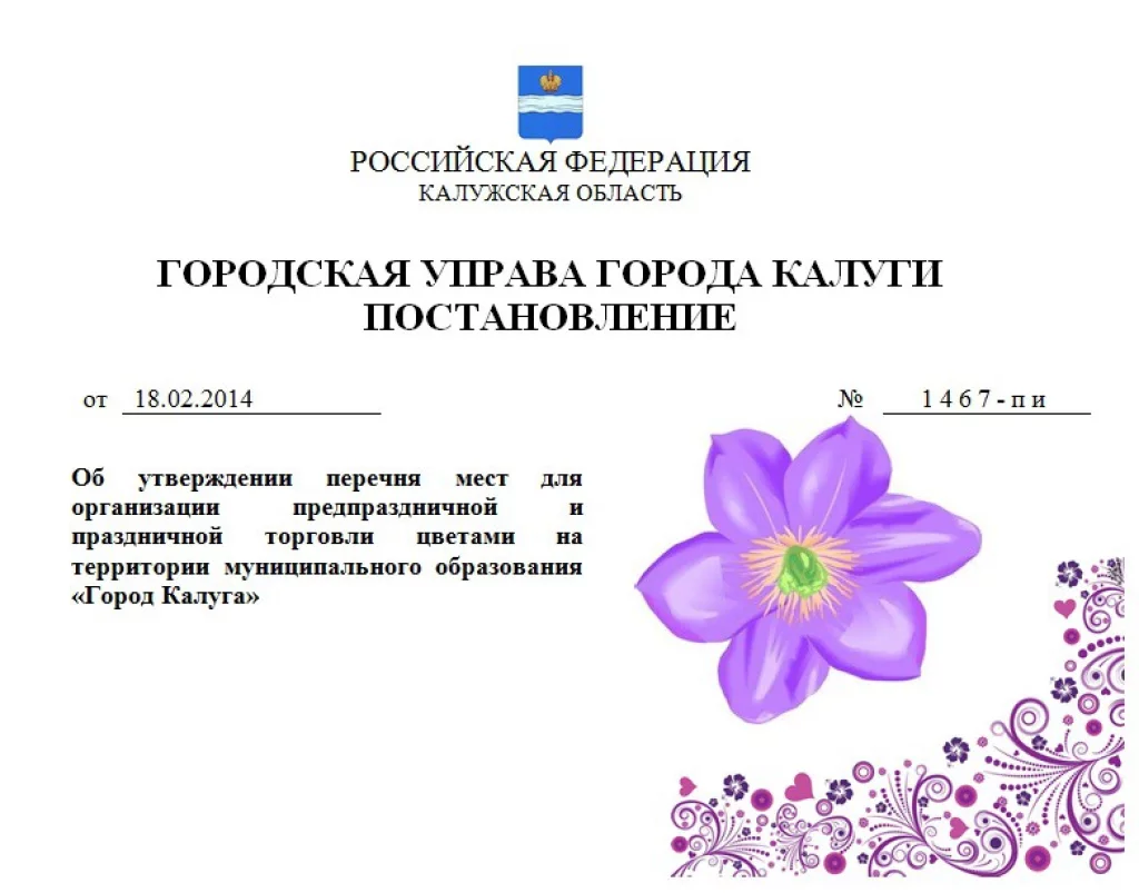 На сайте Горуправы можно найти очень много интересной информации, о которой мы даже не догадываемся. Например после просмотра опроса по поводу необходимости набережной в Калуге, я нашёл постановление и.п. Городского Головы об утверждении перечня мест для организации предпраздничной и праздничной торговли цветами на территории муниципального образования «Город Калуга» в период с 06.03.2014 по 08.03.2014.