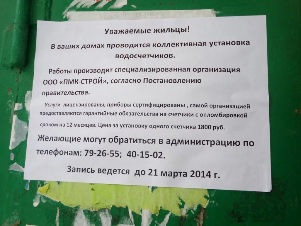 Несколько дней назад на двери подъезда вместо привычных рекламных листовок появилось "объявление" некой фирмы ПМК-Строй. Судя по тексту, нам срочно нужно установить водосчетчики, на основании Постановления аж самого правительства. Насколько подобная реклама, замаскированная под объявления ЖКХ и других подобных служб, законна? Кому пожаловаться? Соседка пришла уточнить, правда ли нужно так быстро и нужно ли действительно счетчики установить, "а то у меня пенсия только на следующей неделе". Зачем так нагло вводить людей, особенно пожилых в заблуждение? Или это я заблуждаюсь?