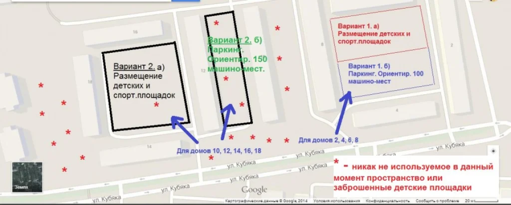 Для удобства визуализации был взят типовой квартал в одном из микрорайонов Калуги. Расписаны предложенные варианты. Указаны "пропадающие" (и даже портящие вид) и утерявшие свое начальное предназначение территории. Например в нижней части схемы находится заброшенная песочница, прогнившая вертикальная лестница, на лавке рядом каждый день собираются люди с опухшими лицами. Такие места не только бесполезны, но даже вредят воспитанию молодого поколения.