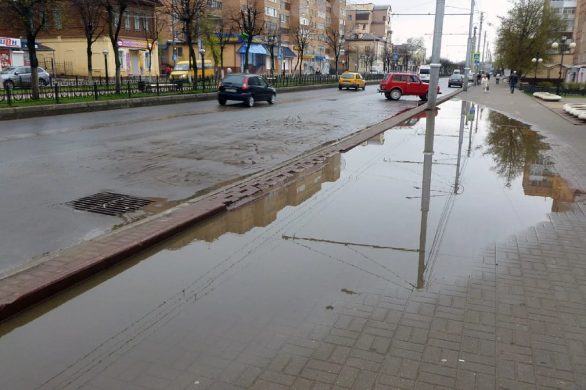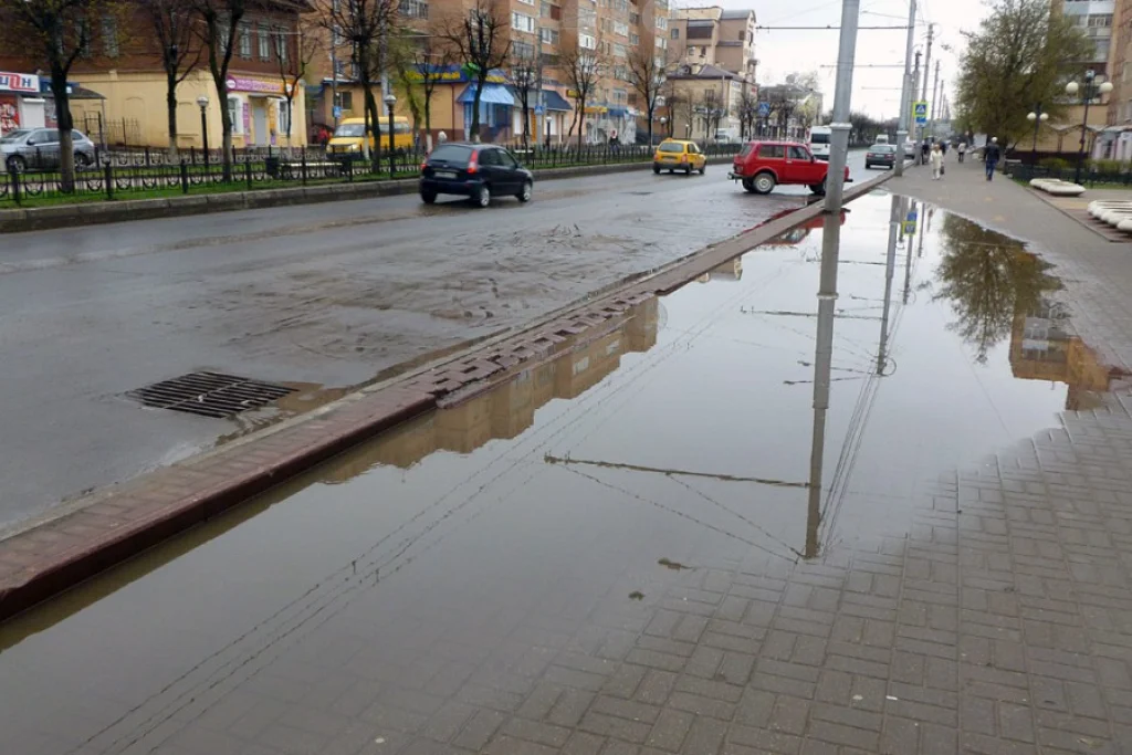 Этой ночью прошёл небольшой весенний дождик, который вызвал вот такое "озеро" на пешеходной части этой улицы. Парадоксально, но "озерко" возникло именно там, где и проводились работы по "улучшению" слива дождевых вод.