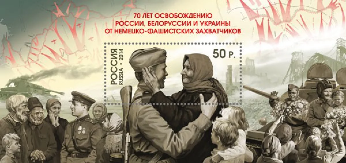 "В 2014 году исполняется 70 лет освобождению России, Белоруссии и Украины от немецко-фашистских захватчиков. В 1942–1943 гг. советские войска одержали значительные победы в ходе обороны Сталинграда, Северо-Кавказской и Курской битвах. Осенью 1943 года Красная армия начинает постепенное освобождение территорий Украины, которое продолжилось форсированием Днепра и занятием целого ряда важных для СССР районов. Значительную роль в ходе войны сыграла операция «Багратион», благодаря которой Советской армии удалось прогнать неприятеля из Белоруссии и части Прибалтики (Литвы и Эстонии). В итоге к концу 1944 года вся территория СССР была освобождена от немецко-фашистских захватчиков." (www.rusmarka.ru)