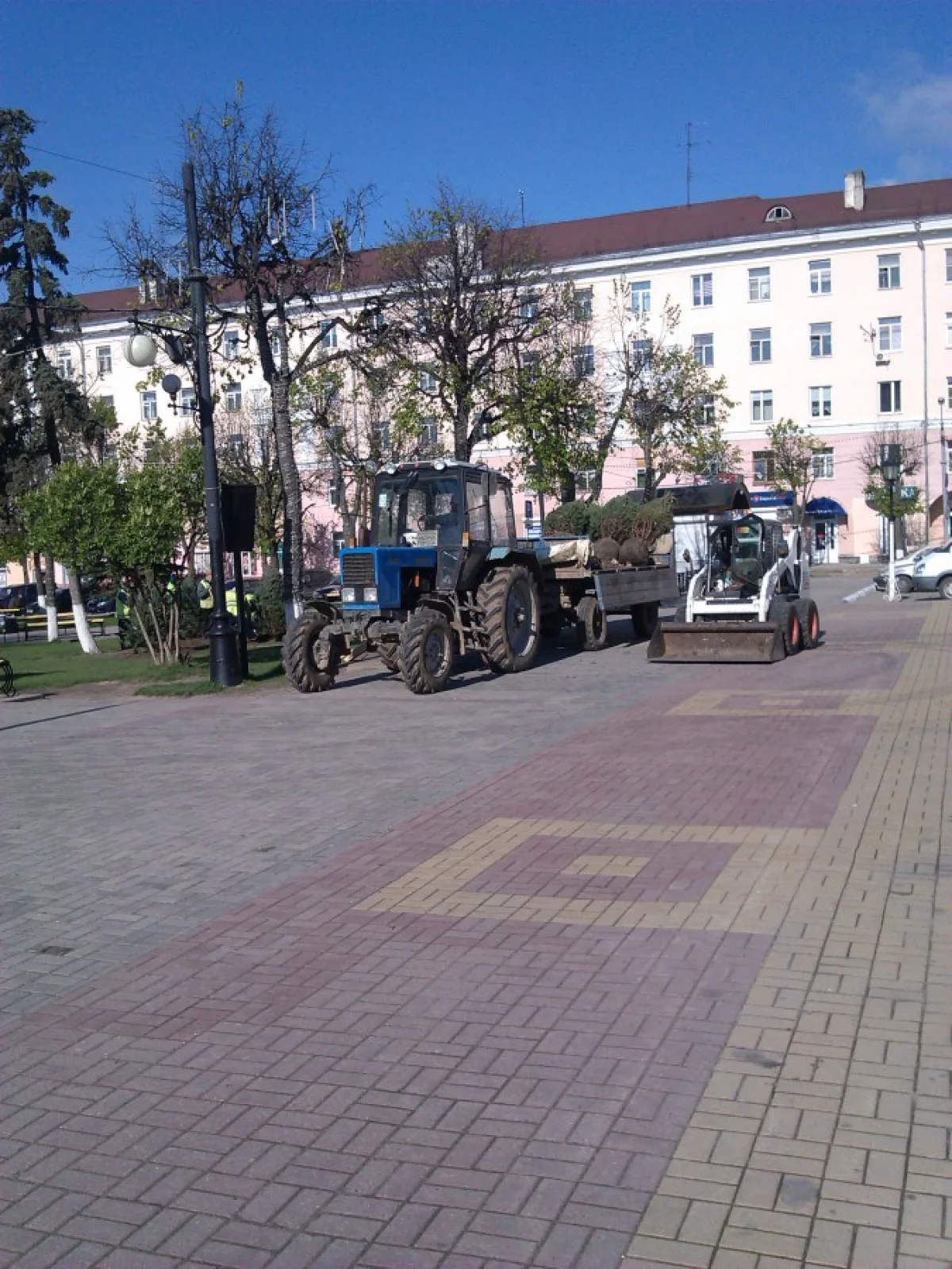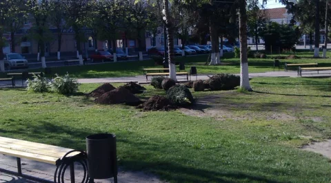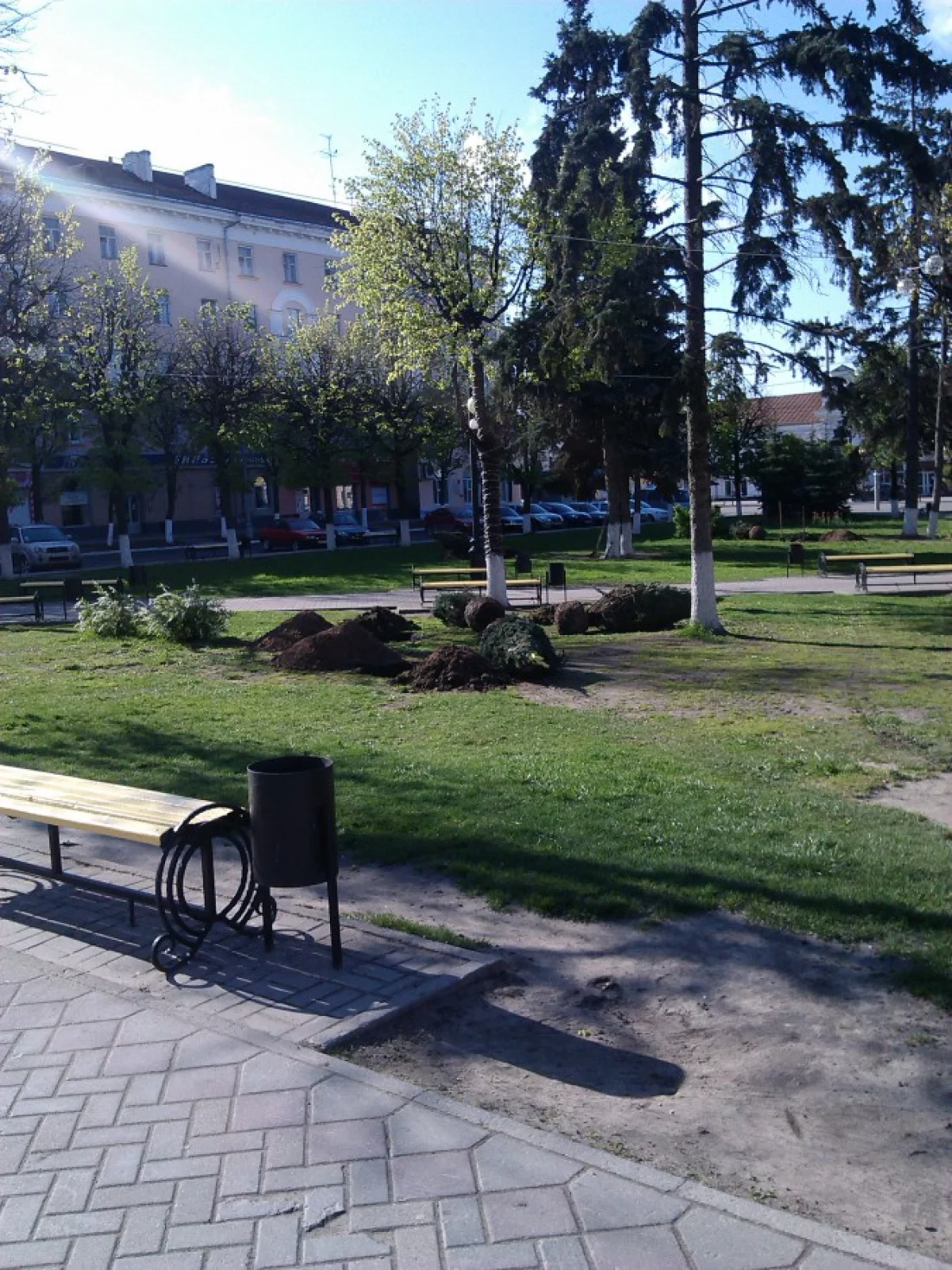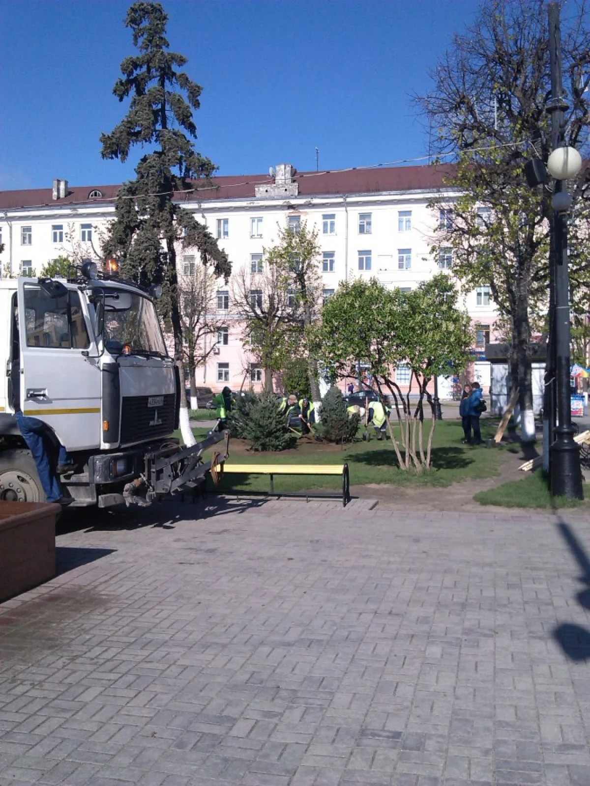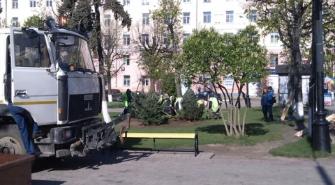 В сквере у театра высаживают елочки.
