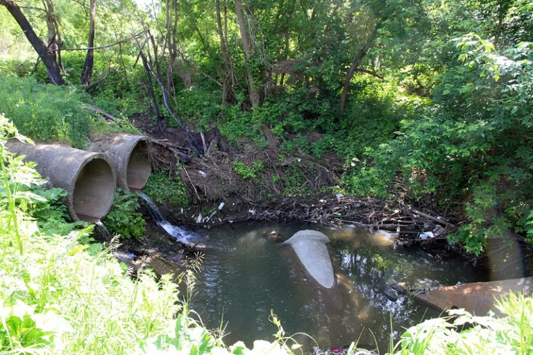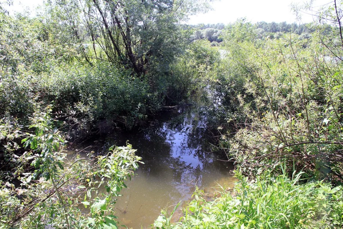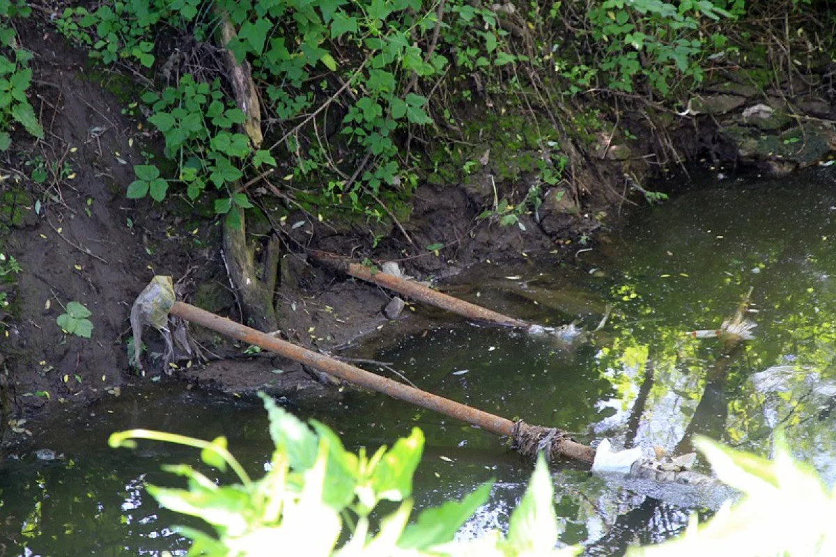 2. От слива из труб до Оки течёт вот такая «речка», длинна которой всего 15 метров, а с чистой воды реки сия «клоака» практически не видна.