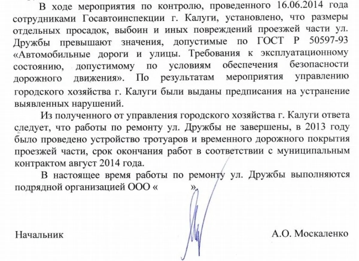 Восстановления справедливости ради пишу, что мне прислали ответ из ГИБДД на моё обращение по поводу ям на ул.Дружбы, и даже более того - до этого отзвонились. Ямы начали заделывать чуть более недели назад, так что в середине этой недели ямки и съезды были заделаны, даже люки подняли - по этому факту и по ответу видно, что будут класть ещё один, финальный слой асфальта. (наименование организации убрал)