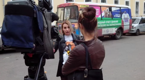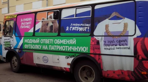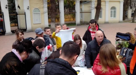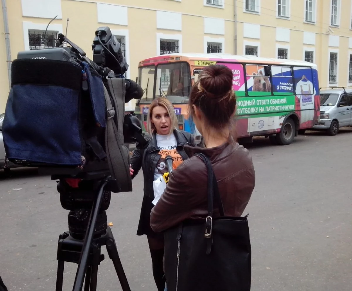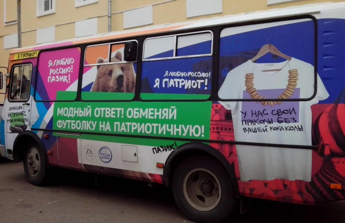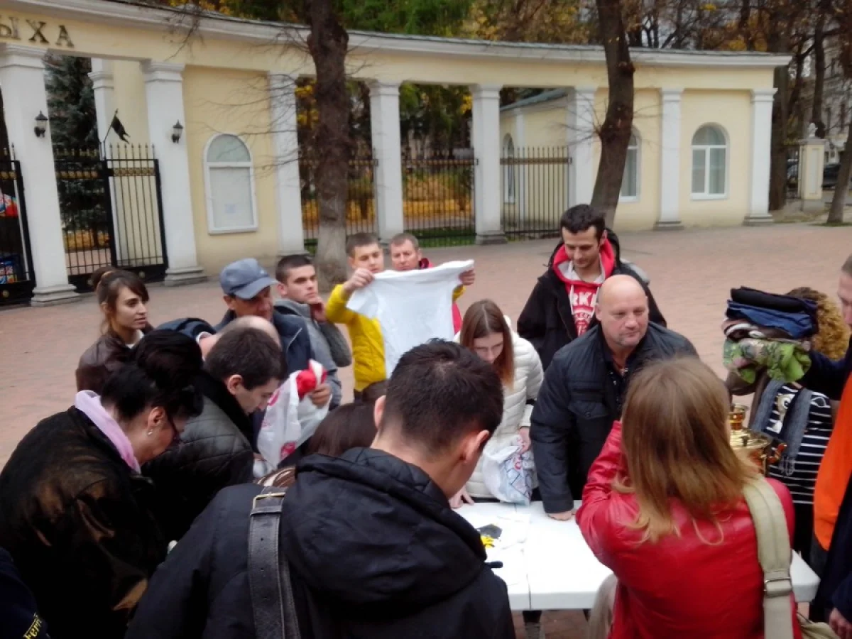 Правда, с пл.Ст.Торг её чуть передвинули - под Арку, ближе ко входу в Парк. Футболки с "правильными надписями" и рисунками, типа: "Мне ваши санкции - по барабану!" разлетелись как горячие пирожки.Несколько десятков счастливиков под прицелами фото- и телекамер бойко совершали обмен, швыряя своё тряпьё с "аглицкими буквами" и заморскими рисунками в отдельный ящик. Взамен получая вожделенное, "нашенское", где ещё и муха не сидела!
